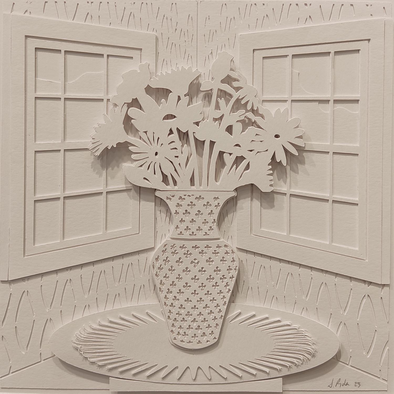 This unique and original contemporary artwork "Flowers in vase on corner" on the subject of Still-life has been created by the contemporary artist Ryder Susan.