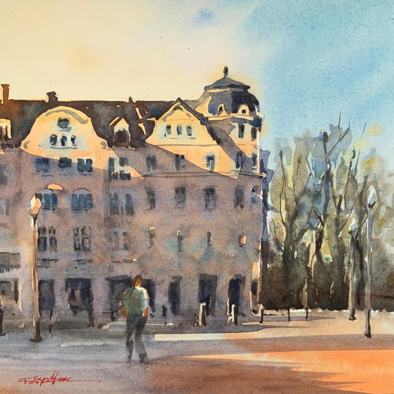 Pintura Promenade sur la place por Seruch Capouillez Isabelle | Pintura Figurative Urban Watercolor