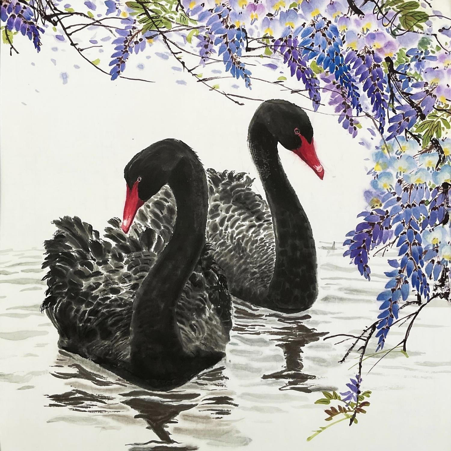 This unique and original contemporary artwork "Black Swans" was created by contemporary artist Tayun. The artist used various techniques to create this small-format figurative painting on paper.