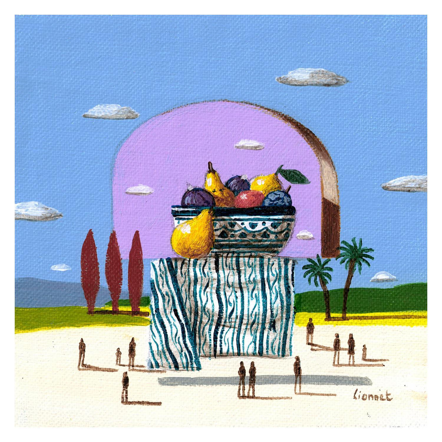 This unique and original contemporary artwork "Coupe de fruits au tissu" on the subjects of Still-life, Landscapes, Life style has been created by the contemporary artist Lionnet Pascal.