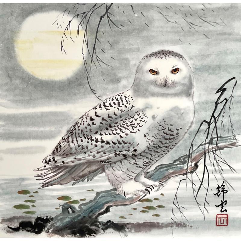 This unique and original contemporary artwork "Snowy Owl" was created by contemporary artist Tayun. The artist used the Ink technique to create this small-format painting on paper in the Figurative style.