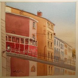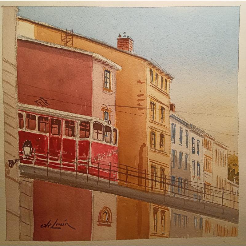 Pintura Téléphérique à Lyon por De León Lévi Marcelo | Pintura Figurative Urban Watercolor