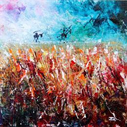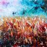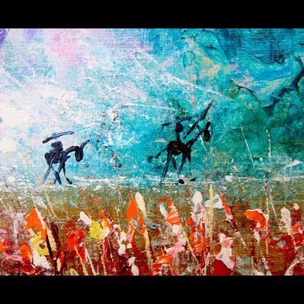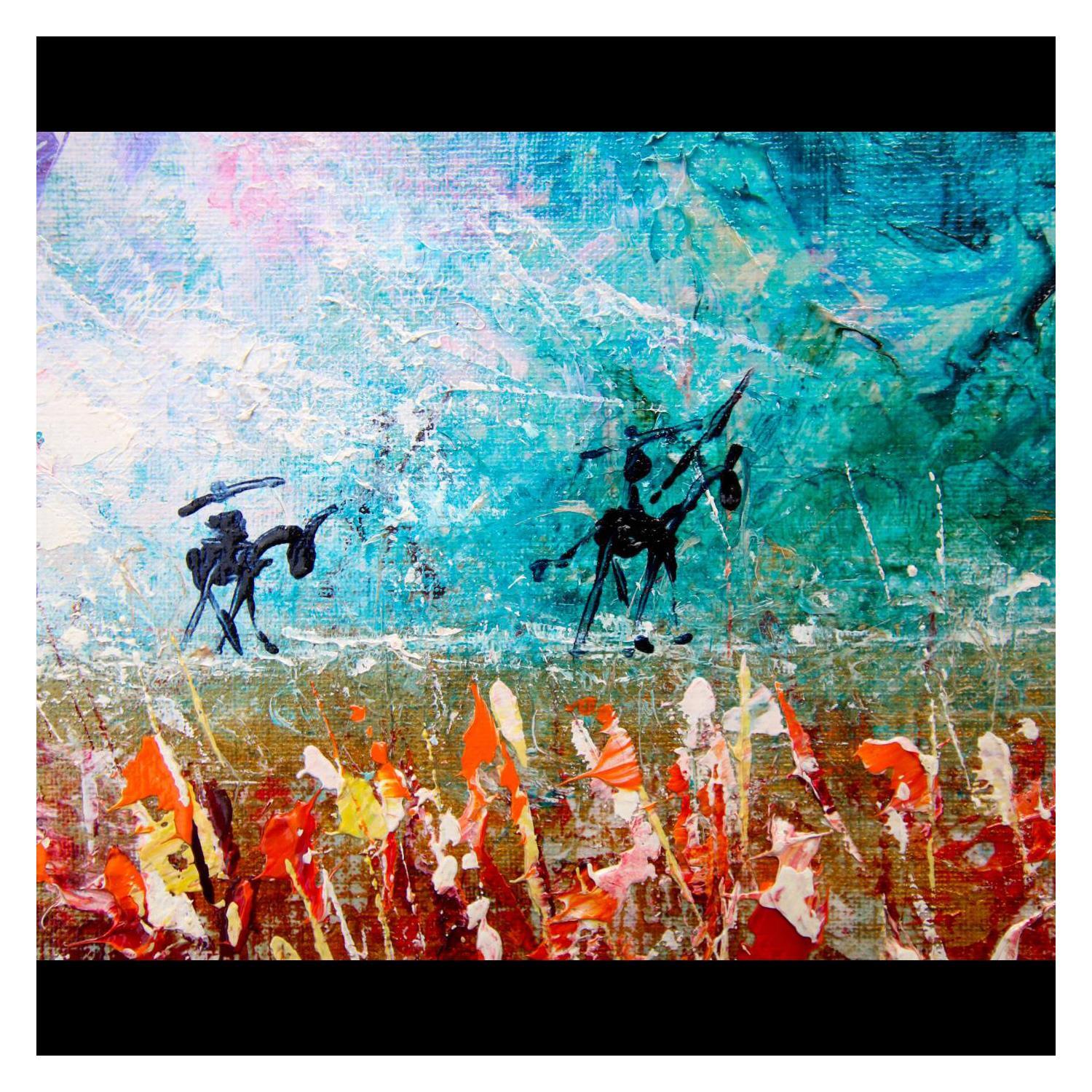 Don Quixote on the Line" depicts the knight-errant riding Rossinante, followed by his faithful squire Sancho Panza. The horizon, high up on the canvas, forms a supporting line for the two figures, who are clearly visible in the background. The main focus is on the foreground: luxuriant vegetation painted with a knife in flat tints and tears of liquid material, giving movement to the motif.
