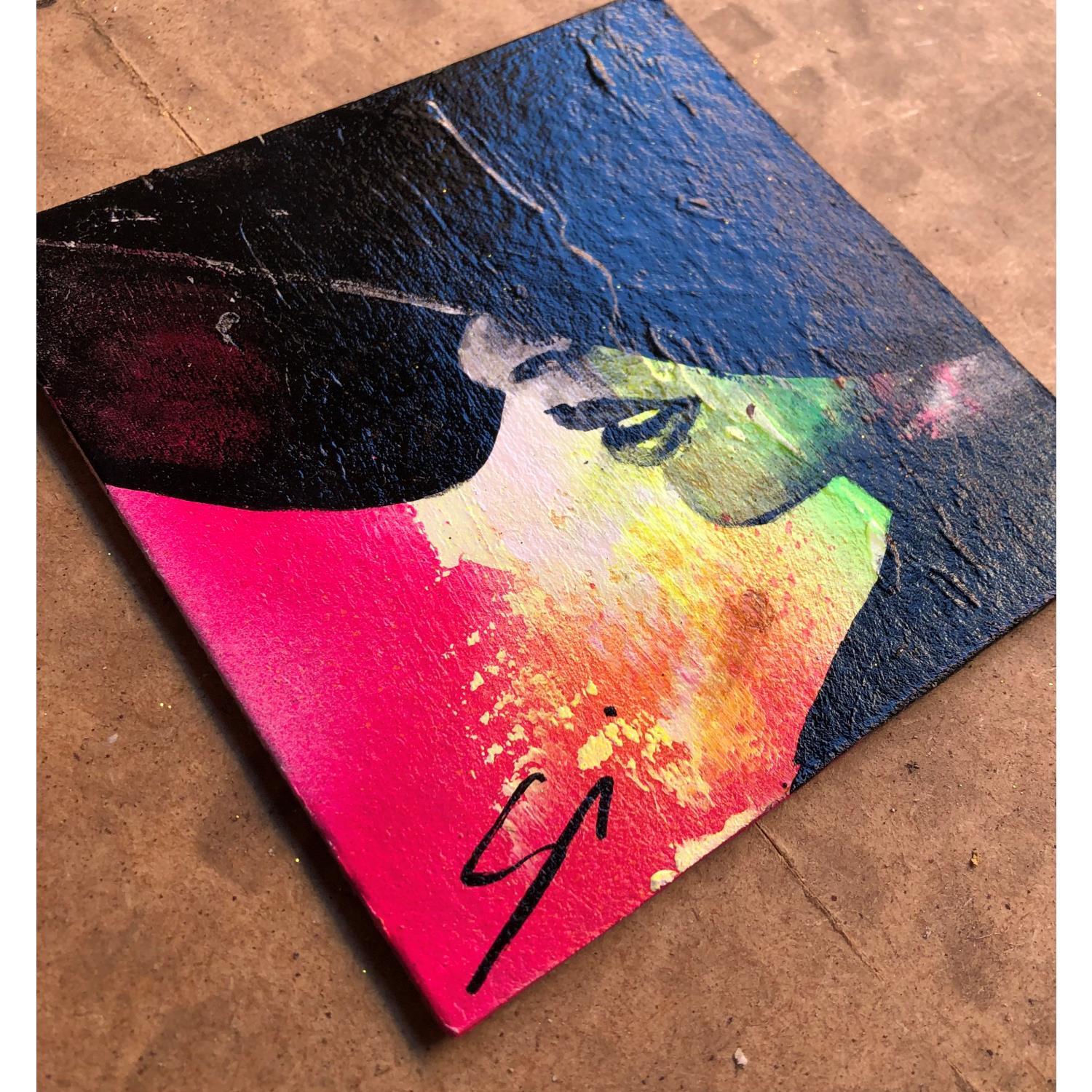 The artist used Graffiti, Acrylic media on Cardboard to create this Pop-art, Small size painting.