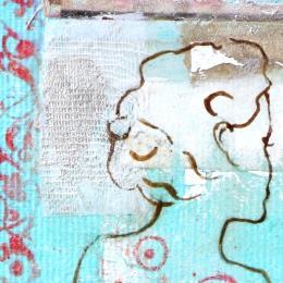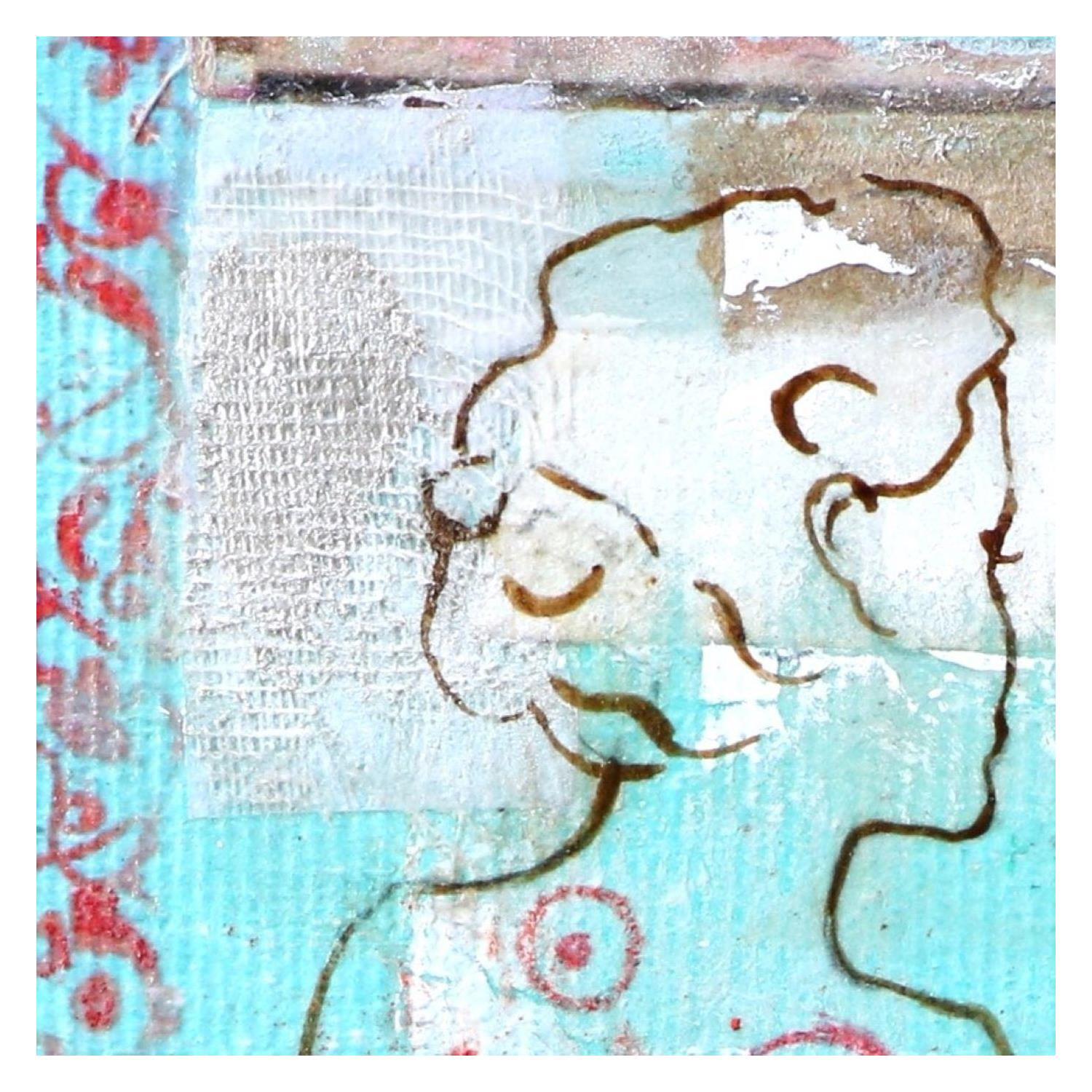 The artist used ink, acrylic, dry pastel and recycled materials to create this small-format painting on canvas on wood in the Art Singulier style.