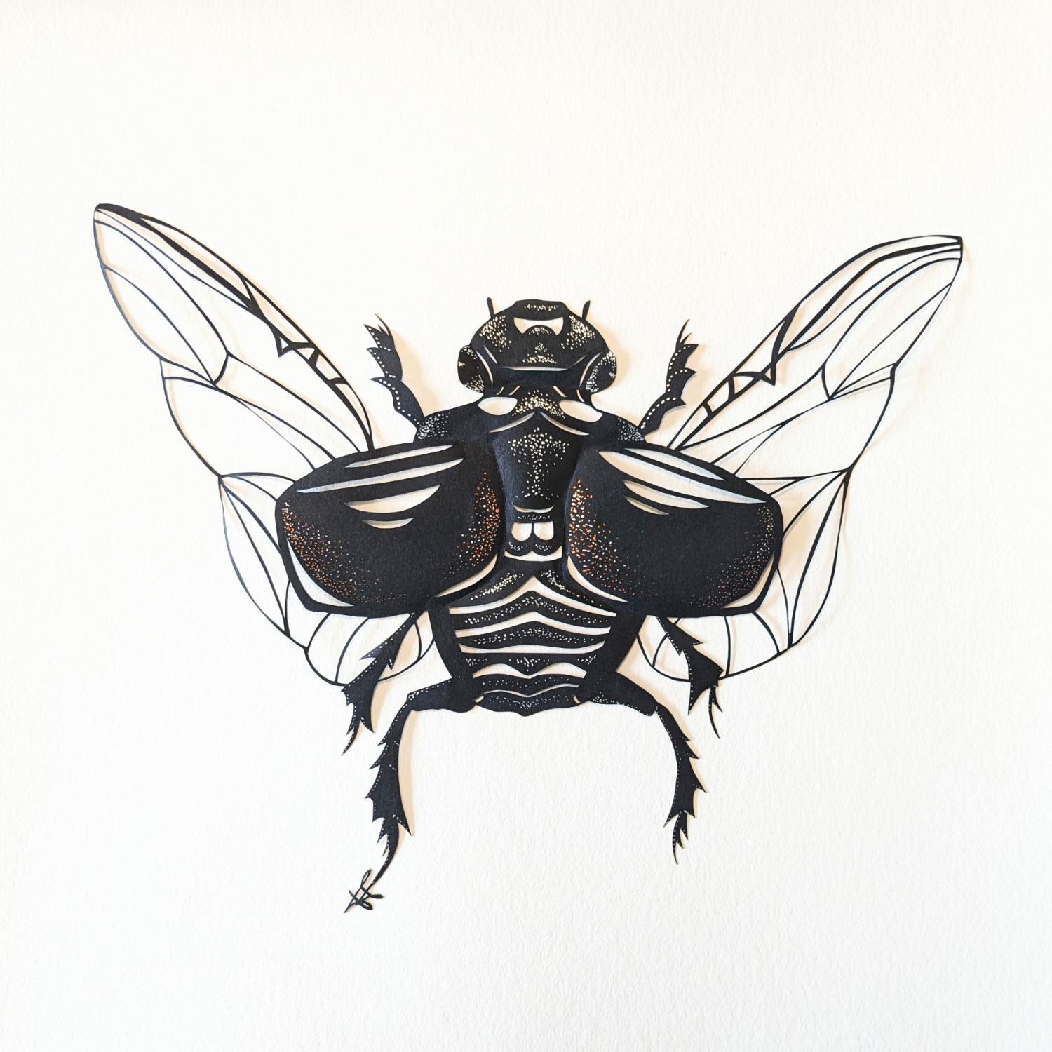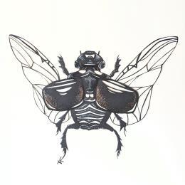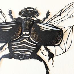 The artist used a paper-cut technique to create this small format with a singular style, and then colored it with small touches of iridescent paint.