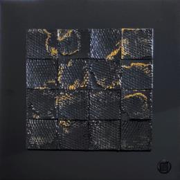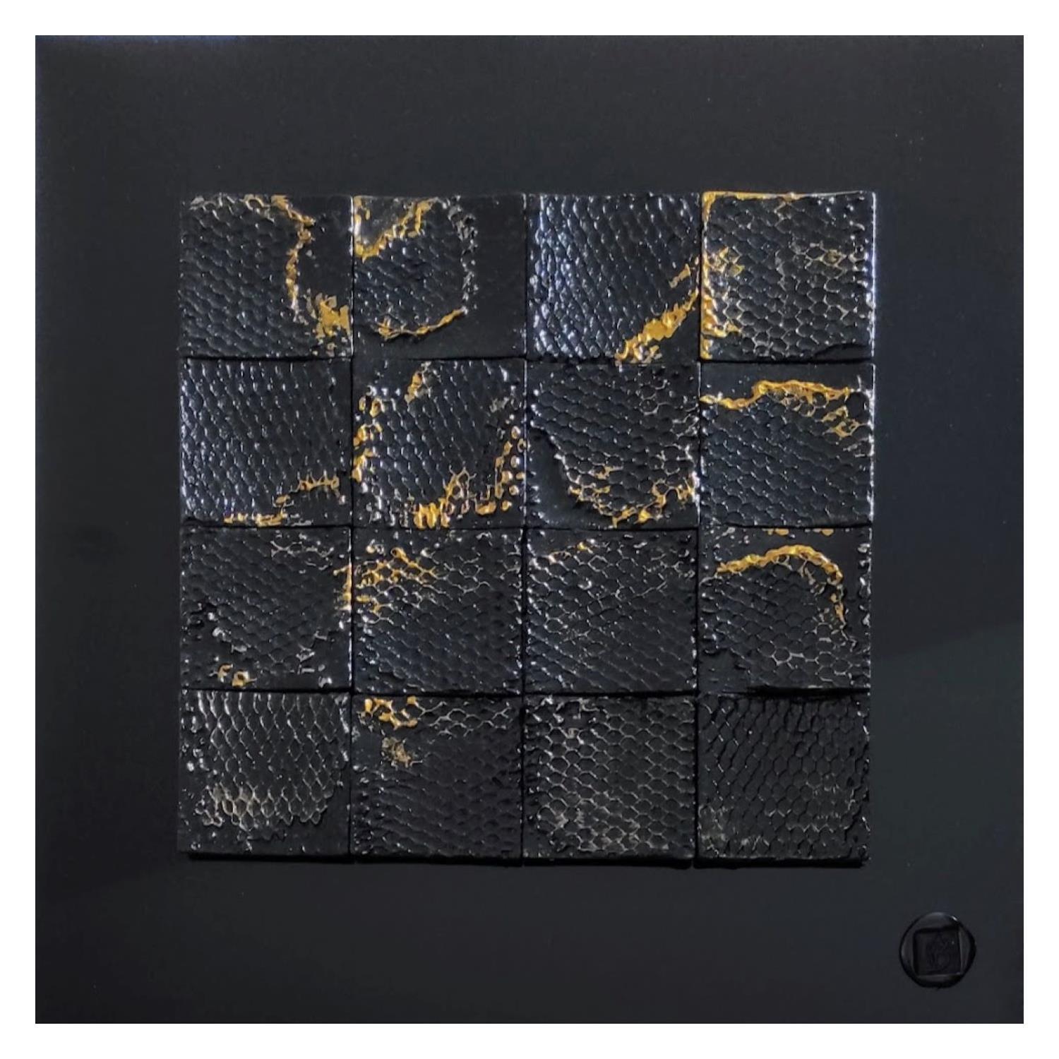 The artist used Acrylic, Wood, Gluing, Lacquer media on Dibon to create this Abstract, Small size painting.