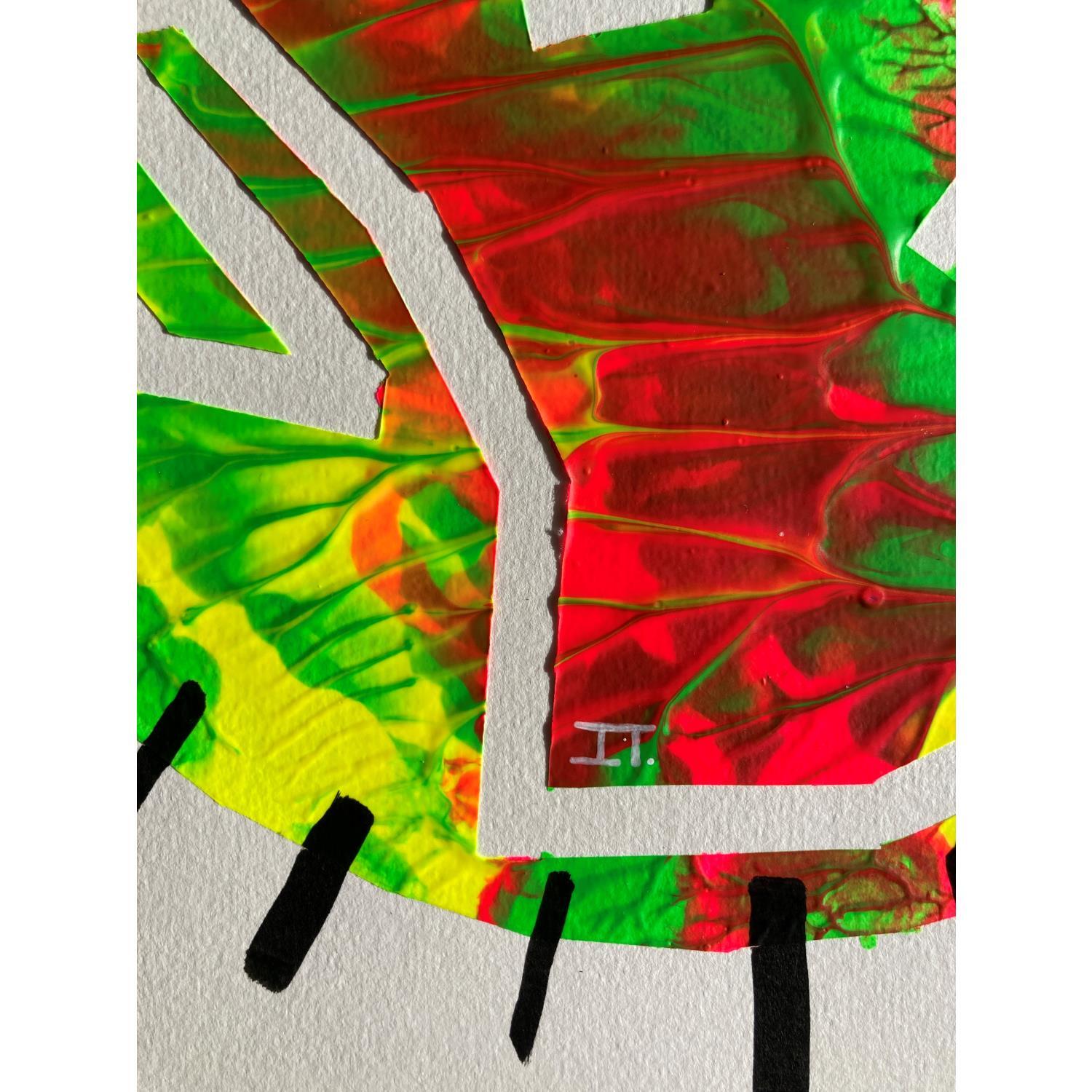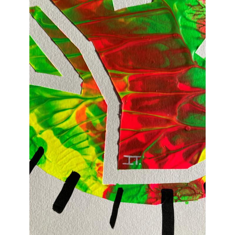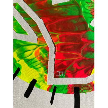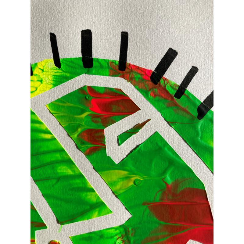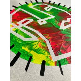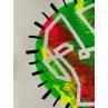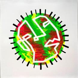 This is a unique work, but very similar to "Twins 1" in that they were made using a technique that came together to create this texture of paint waves, like a mountain relief with green, fuchsia and yellow colors. It has a negative face made of a single continuous line looking to the left. It is framed by small black lines all along the profile of the circle.