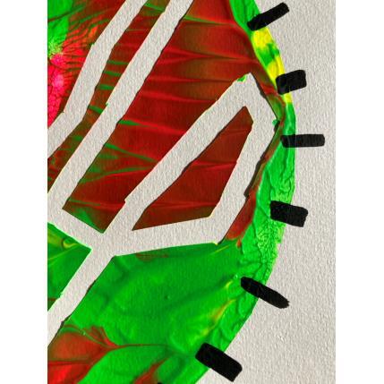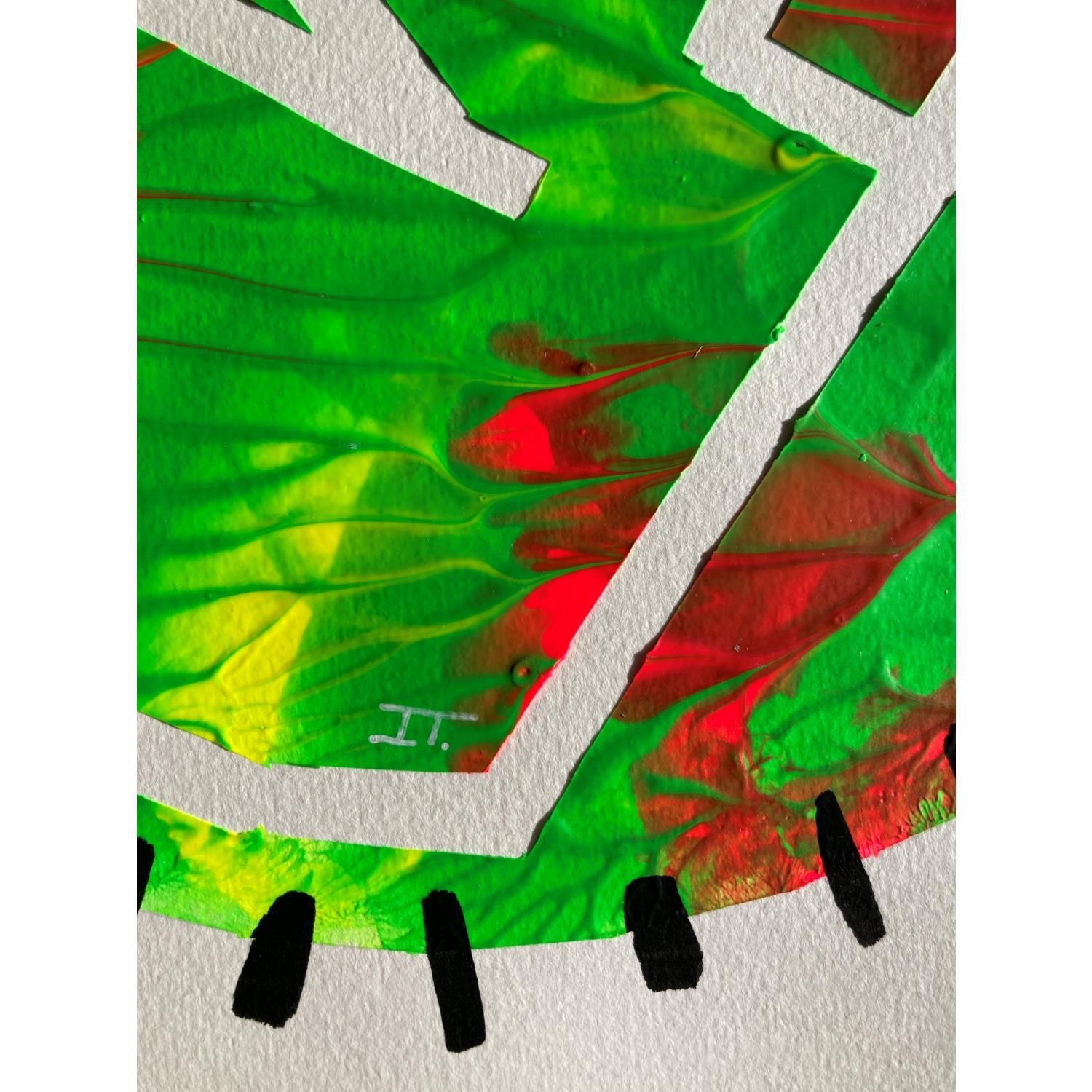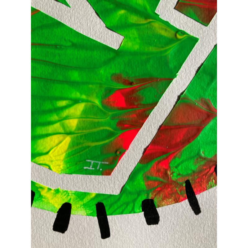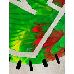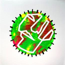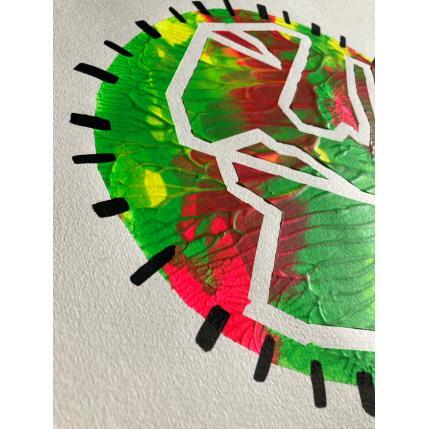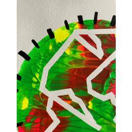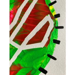 This is a unique work, but very similar to "Twins 2" in that they were made using a technique that came together to create this texture of paint waves, like a mountain relief with green, fuchsia and yellow colors. It has a negative face made of a single continuous line looking to the left. It is framed by small black lines all along the profile of the circle.