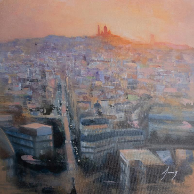 This unique and original contemporary artwork "Montmartre flamboie" on the subjects of Landscapes, Urban has been created by the contemporary artist Jung François.