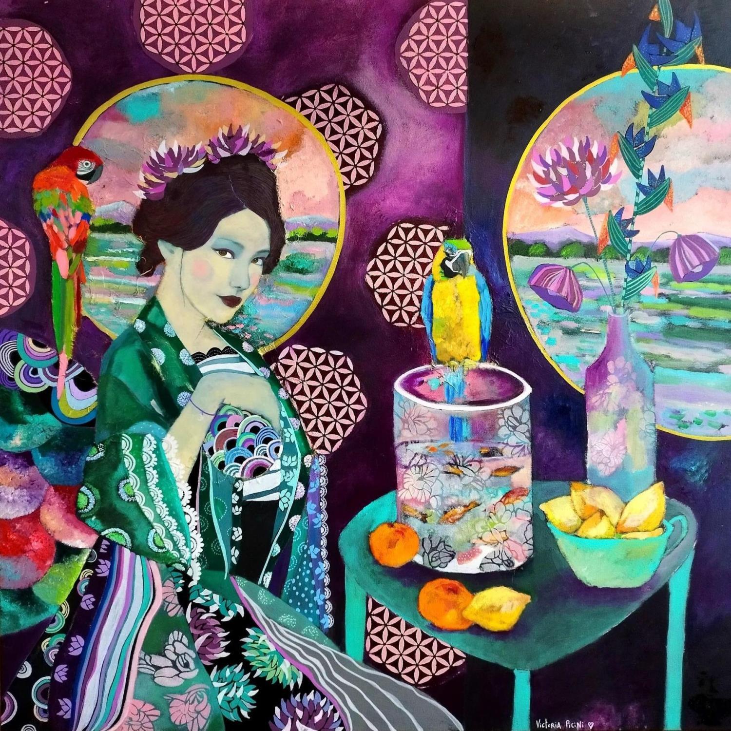 Pintura Geisha intérieur pourpre aux perroquets por Picini Victoria | Pintura Figurative Portrait Landscapes Still-life Acrylic Gluing