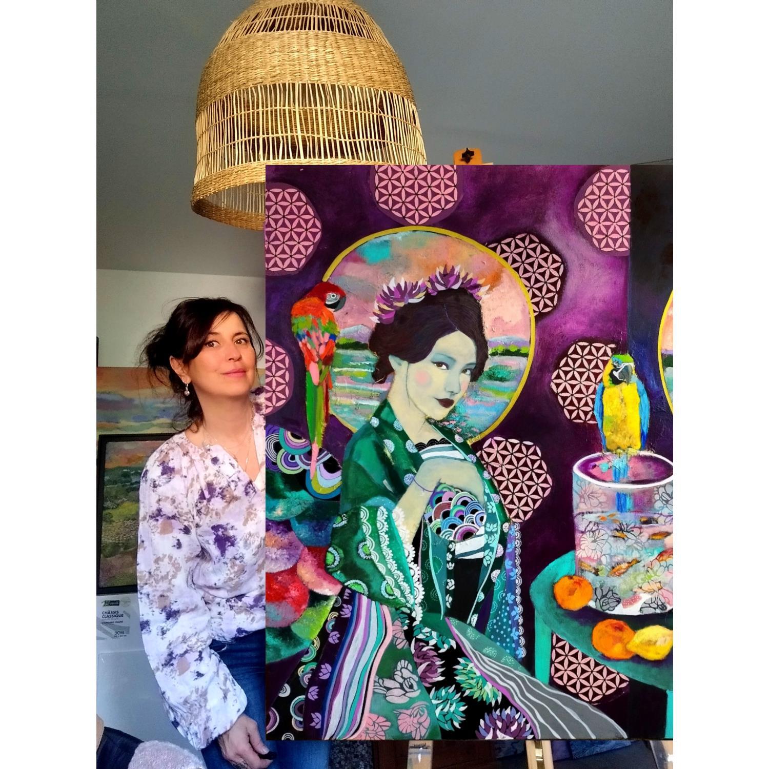 This unique and original contemporary artwork "Geisha intérieur pourpre aux parroquets" was created by contemporary artist Picini Victoria. The artist used Acrylic and Collage techniques to create this large-format figurative painting on the theme of Landscapes.