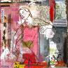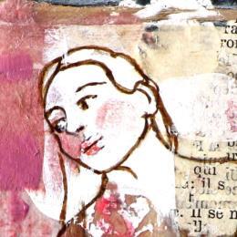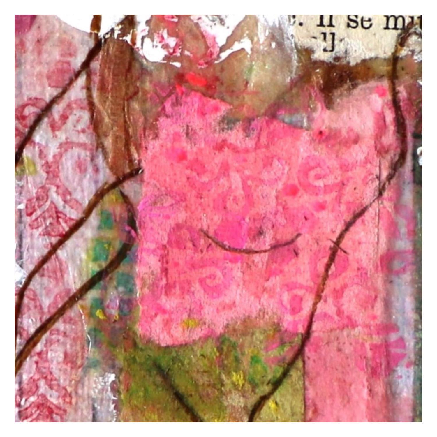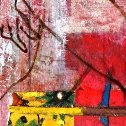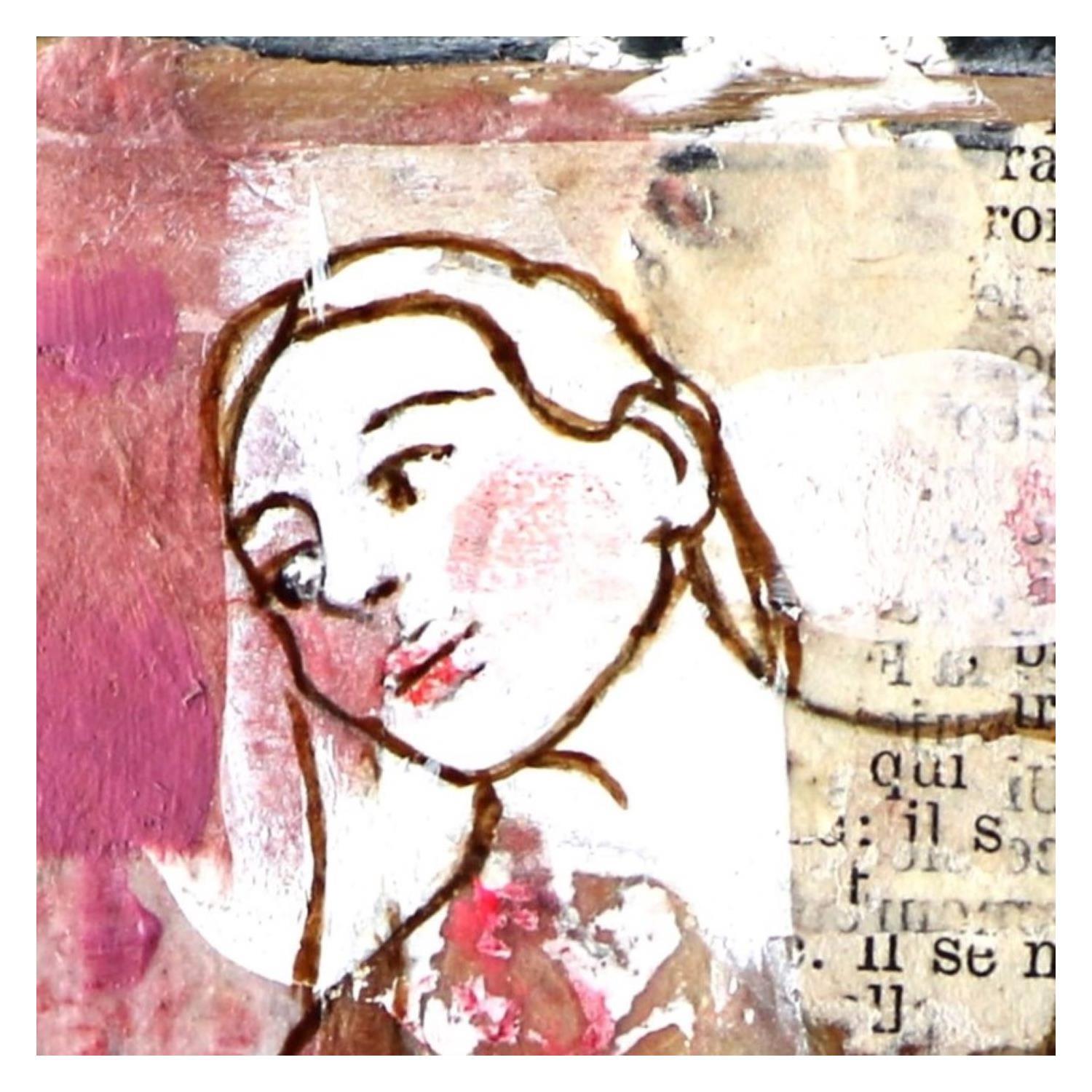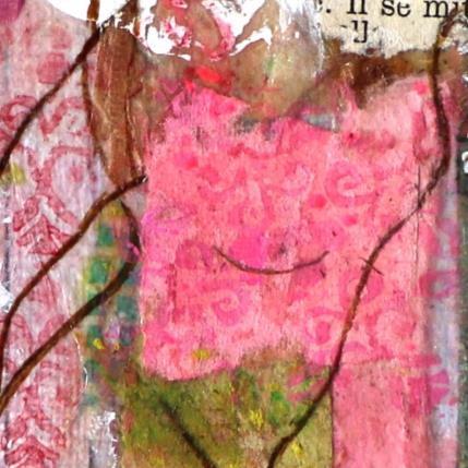 The artist used mixed media, upcycling, dry pastels, ink, acrylics, stamping and recycled materials to create this small-format painting on canvas on wood in the figurative art style.