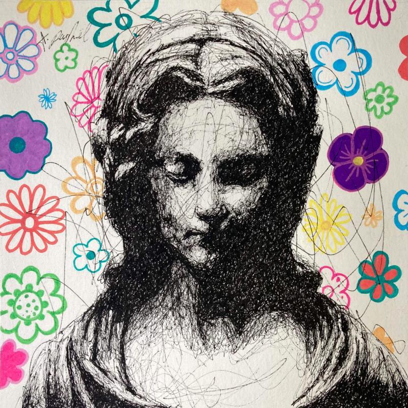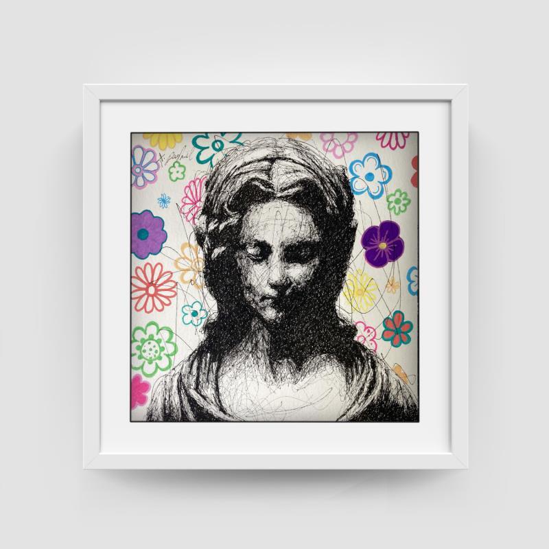 This unique and original contemporary artwork "Femme aux fleurs" on the subject of Portrait has been created by the contemporary artist André Raphaël.