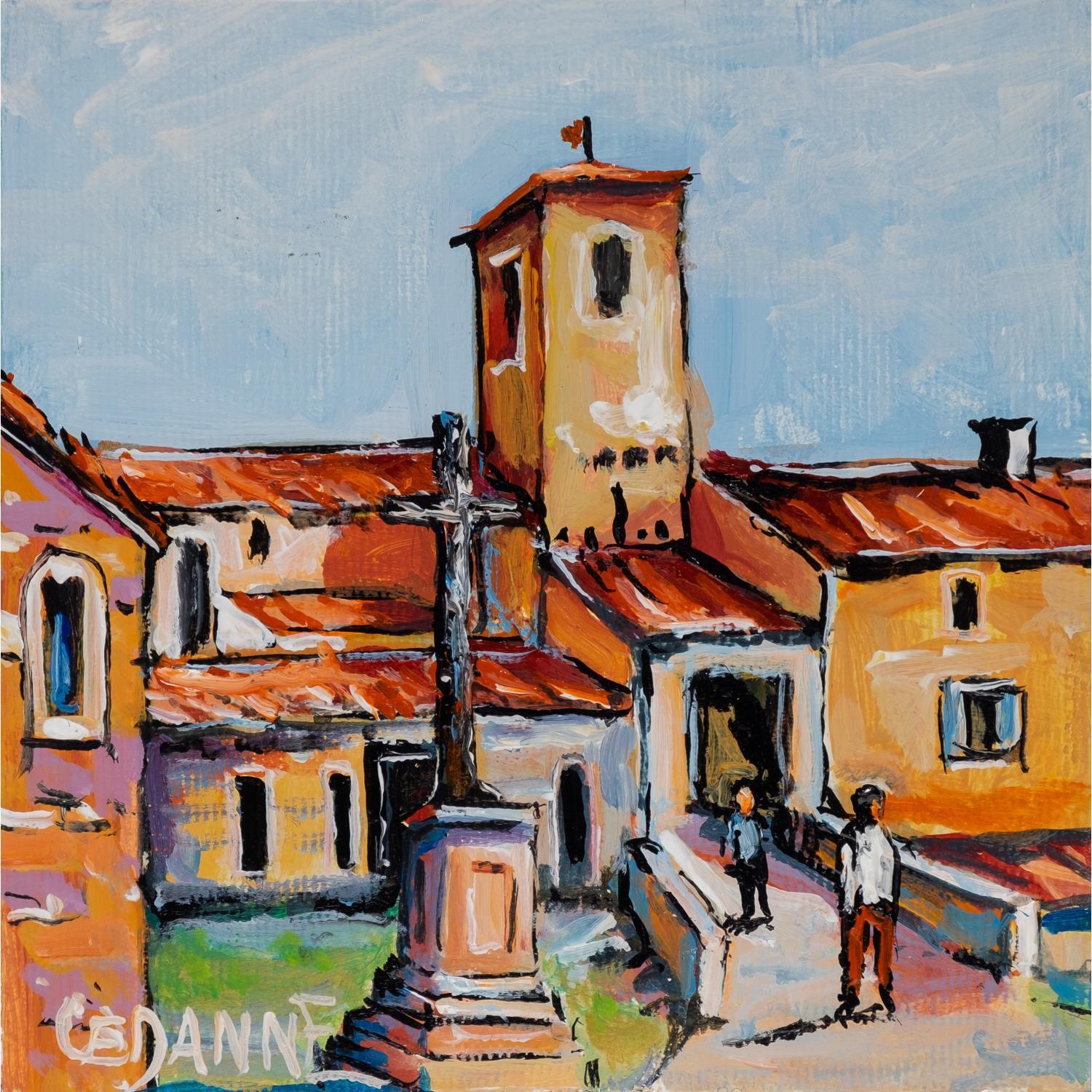 This unique and original contemporary artwork "Entrée du village aux couleurs dorées" on the subjects of Landscapes, Urban, Life style has been created by the contemporary artist Cédanne.