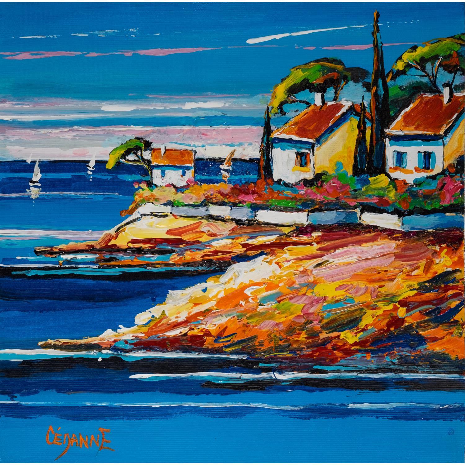 This unique and original contemporary artwork "Mer bleue et rochers ocres" on the subjects of Landscapes, Marine has been created by the contemporary artist Cédanne.