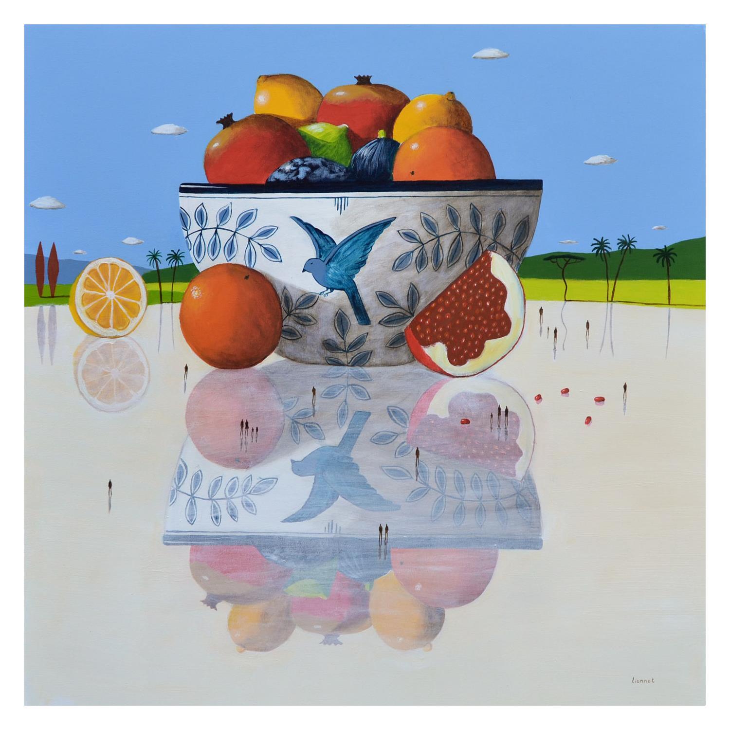 This unique and original contemporary artwork "Reflet aux fruits" on the subjects of Still-life, Landscapes, Life style has been created by the contemporary artist Lionnet Pascal.