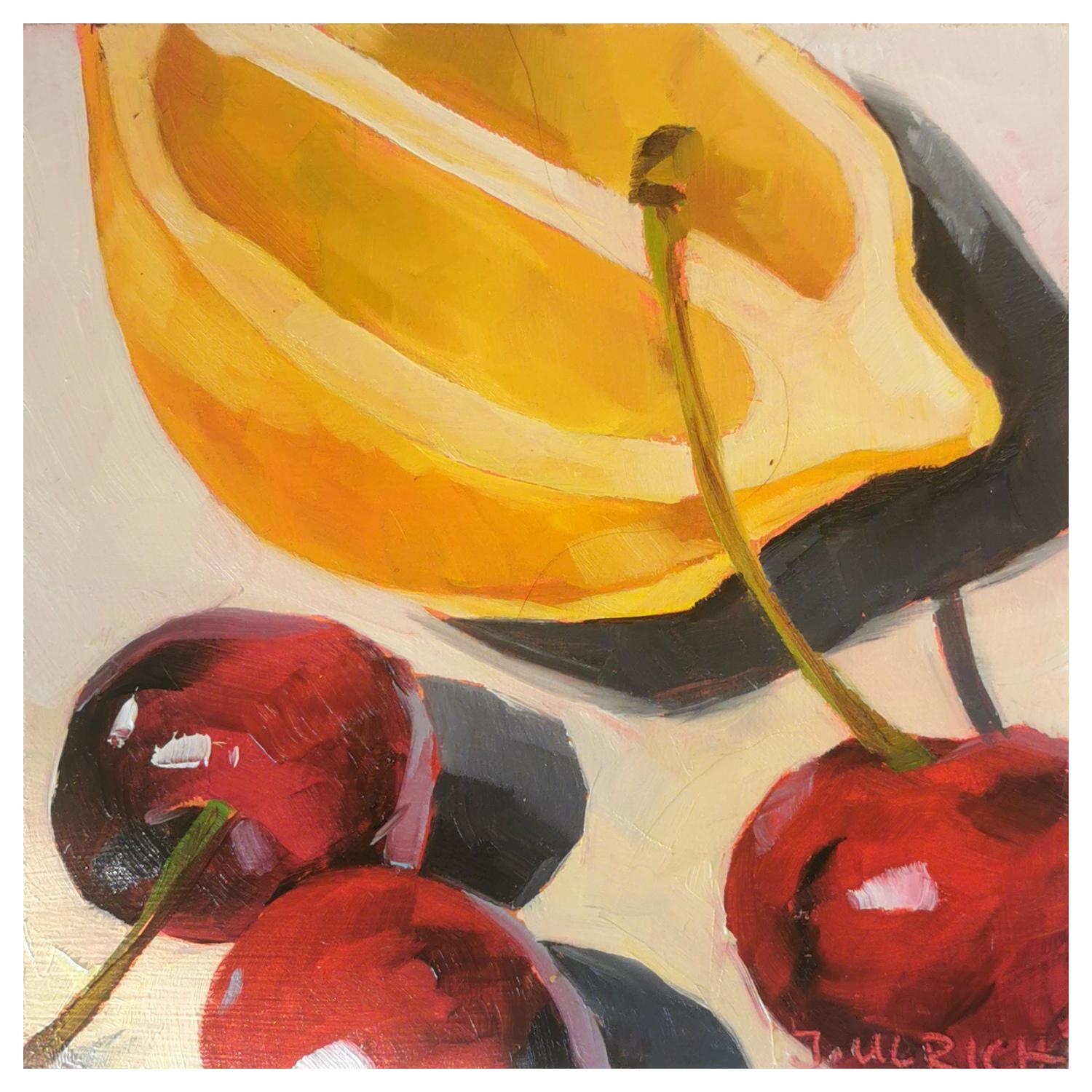This unique and original contemporary artwork "cherries and lemon no.2" on the subject of Still-life has been created by the contemporary artist Ulrich Julia.