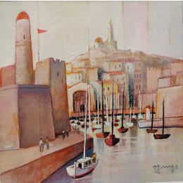 This unique and original contemporary artwork "Entrée au port" on the subjects of Landscapes, Architecture, Life style has been created by the contemporary artist Burgi Roger.