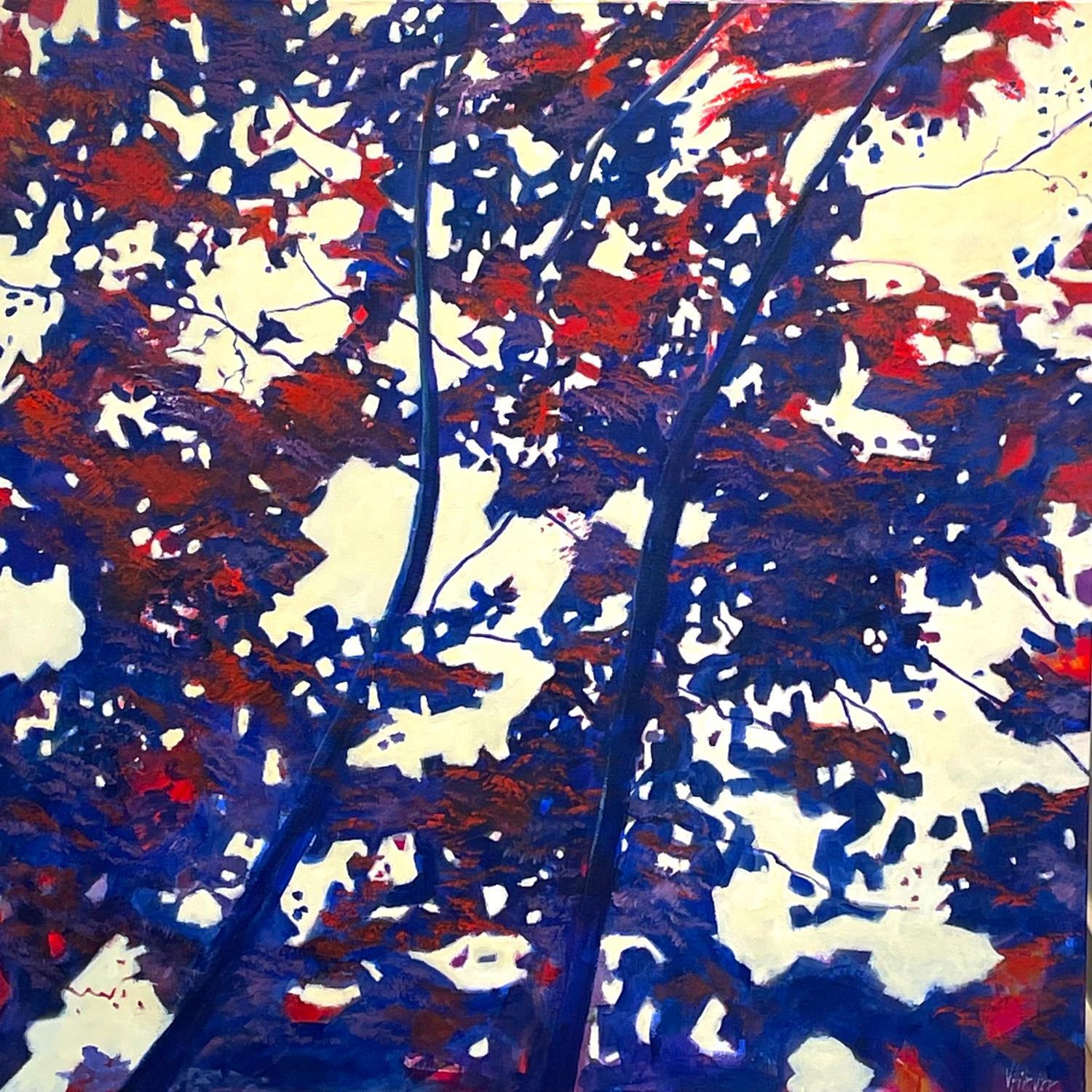 This unique and original contemporary artwork "Feuillages en bleu et rouge" has been created by the contemporary artist Fièvre Véronique.
