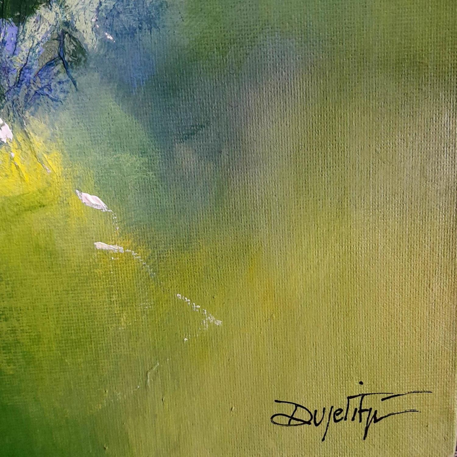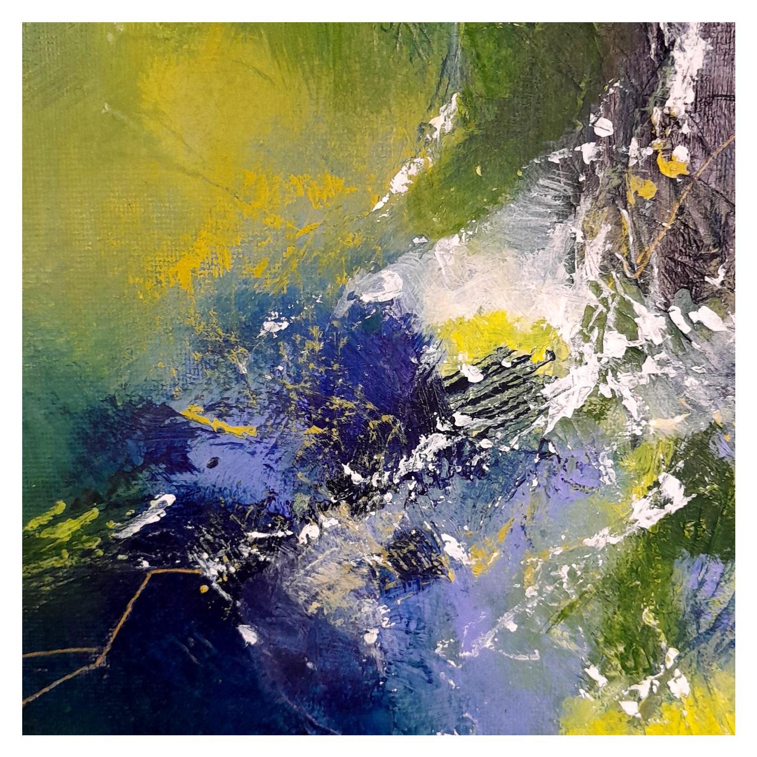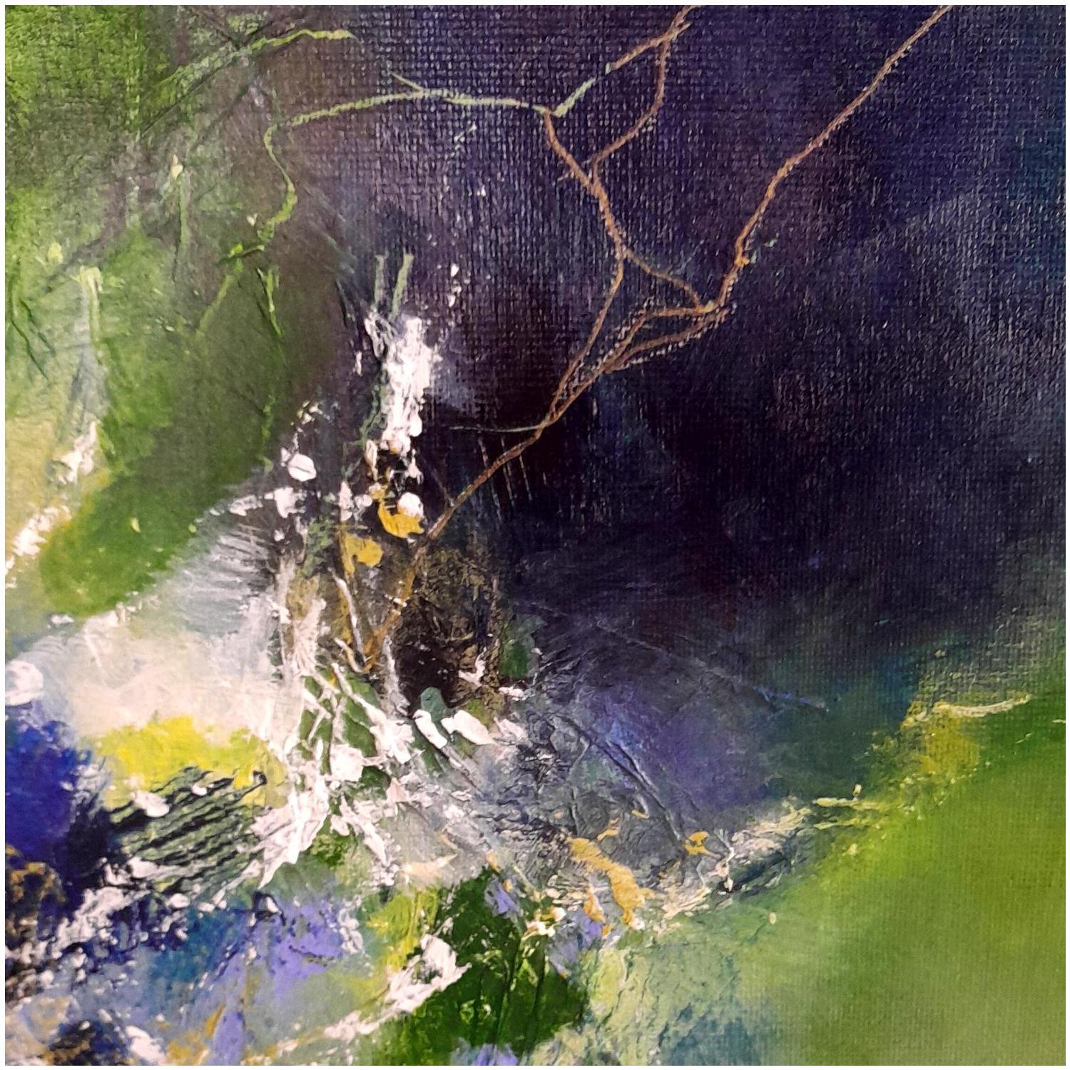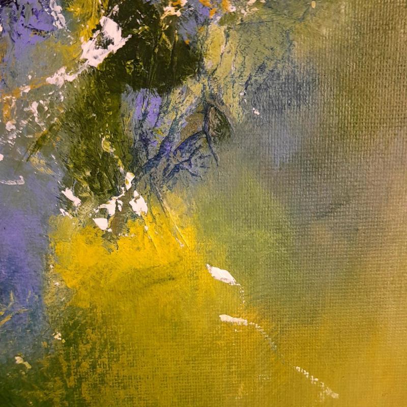 "Promemons-nous"... in the woods. I was inspired by nature and the colors of spring. The traces that criss-cross the work at an angle are an illustration of the Japanese art of Kintsugi, which repairs broken objects by revealing the cracks. It's also an evocation of a nature that has been battered, but remains beautiful and inspiring in spite of it all.