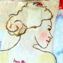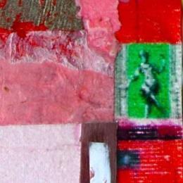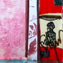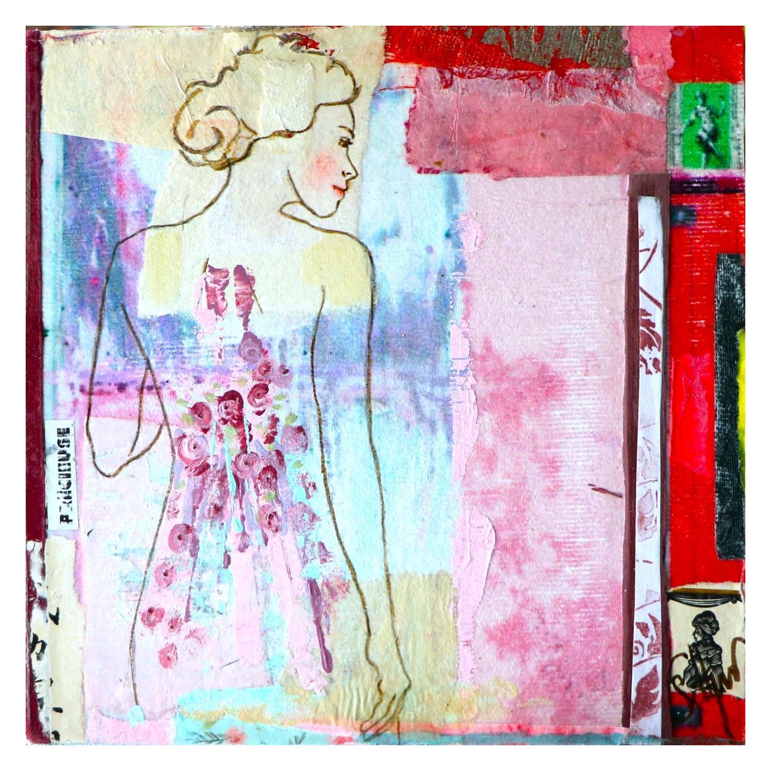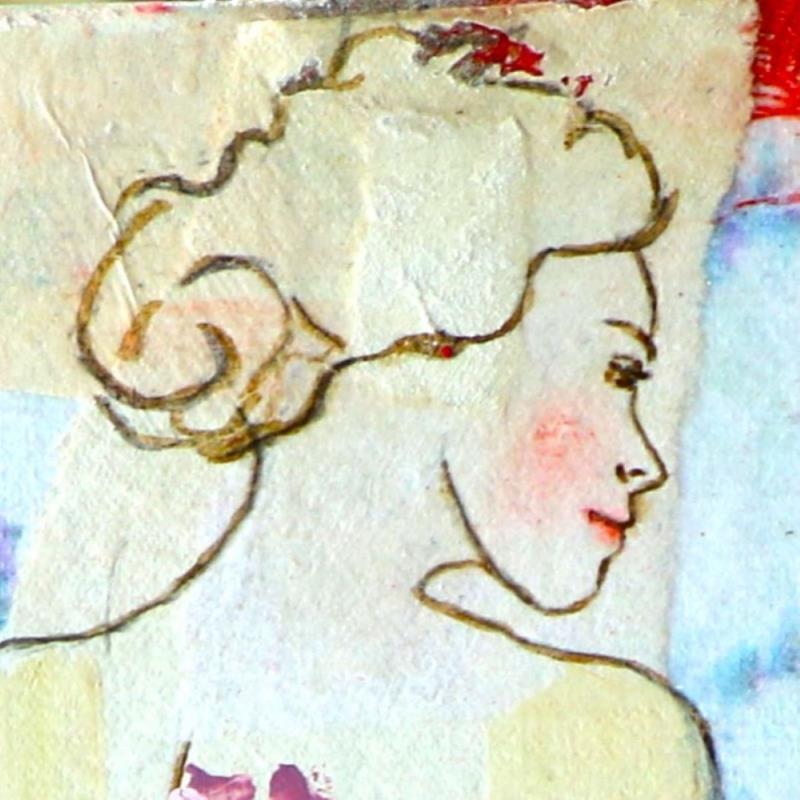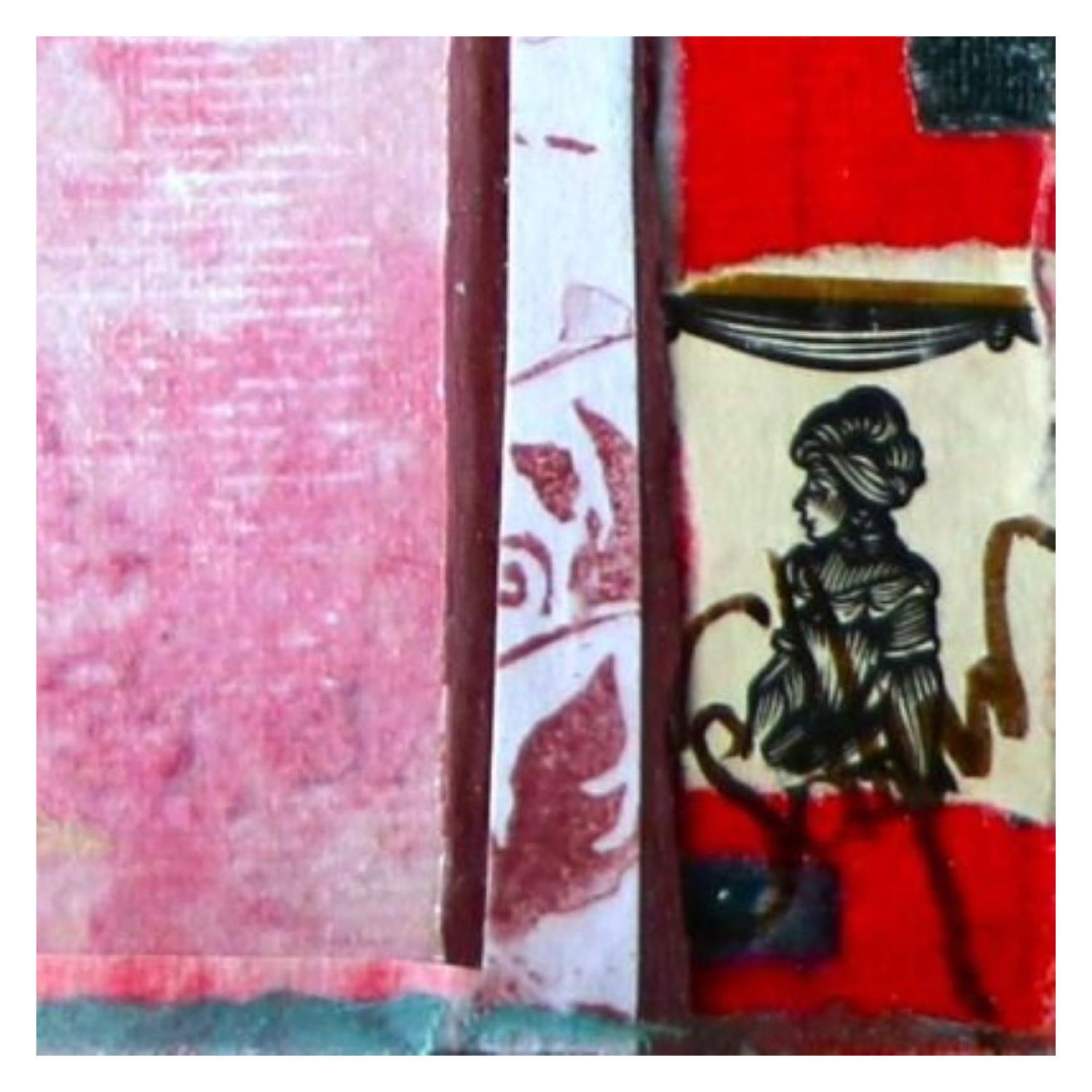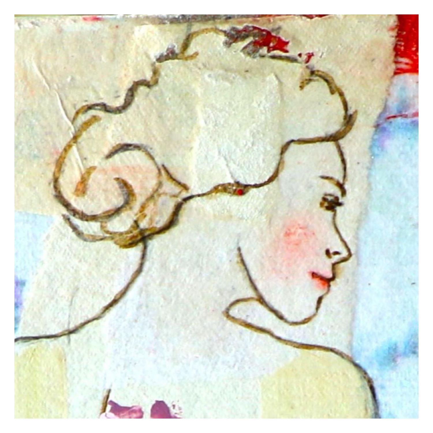The artist used mixed media, Stamping, Ink, Acrylic, Collage d'art, Upcycling to create this small-format canvas on Wood Singular Art style painting on the theme Scenes of life.