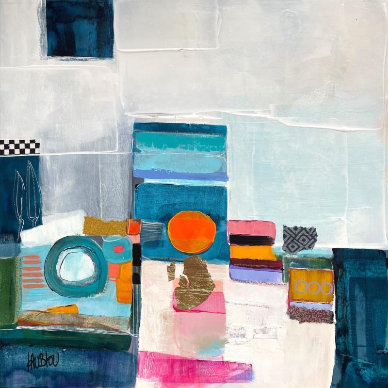 The artist used Acrylic, Gluing, Gold leaf, Paper, Pastel media on Cardboard to create this Abstract, Small size painting.