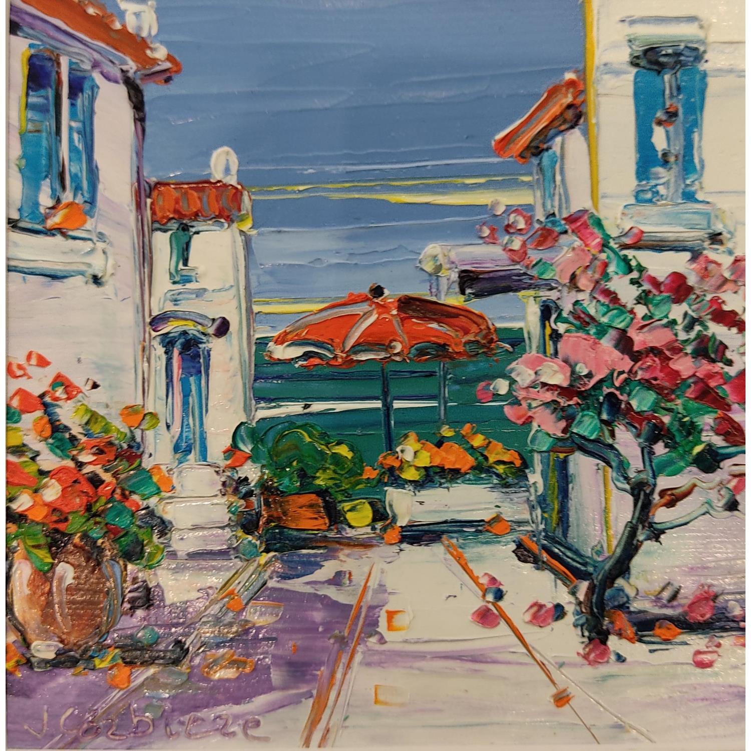 This unique and original contemporary artwork "Terrasse au bord de l'eau" on the subject of Landscapes has been created by the contemporary artist Corbière Liisa.