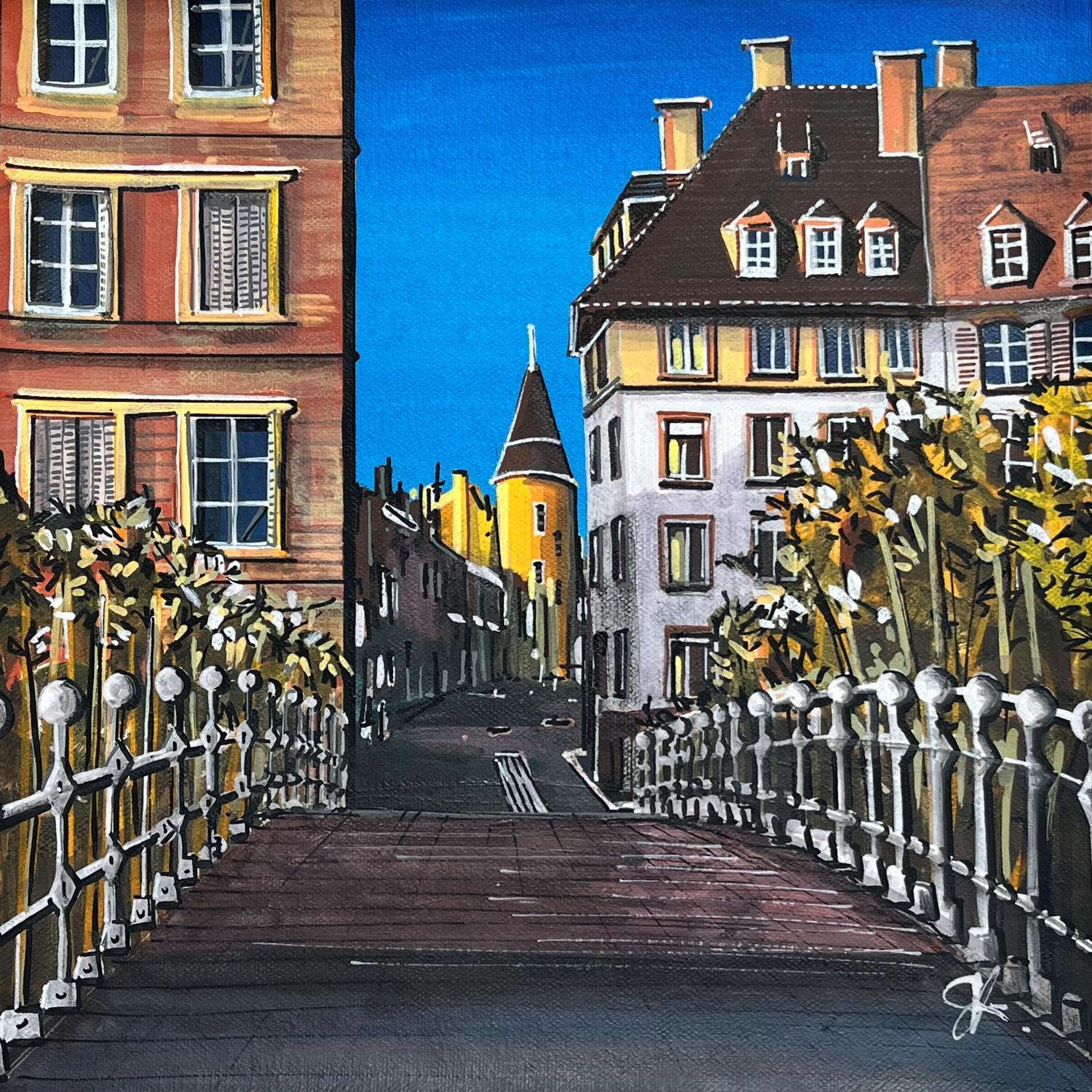 This unique and original contemporary artwork "La passerelle de l'abreuvoir à Strasbourg" on the subjects of Architecture, Landscapes, Urban has been created by the contemporary artist Touras Sophie-Kim .