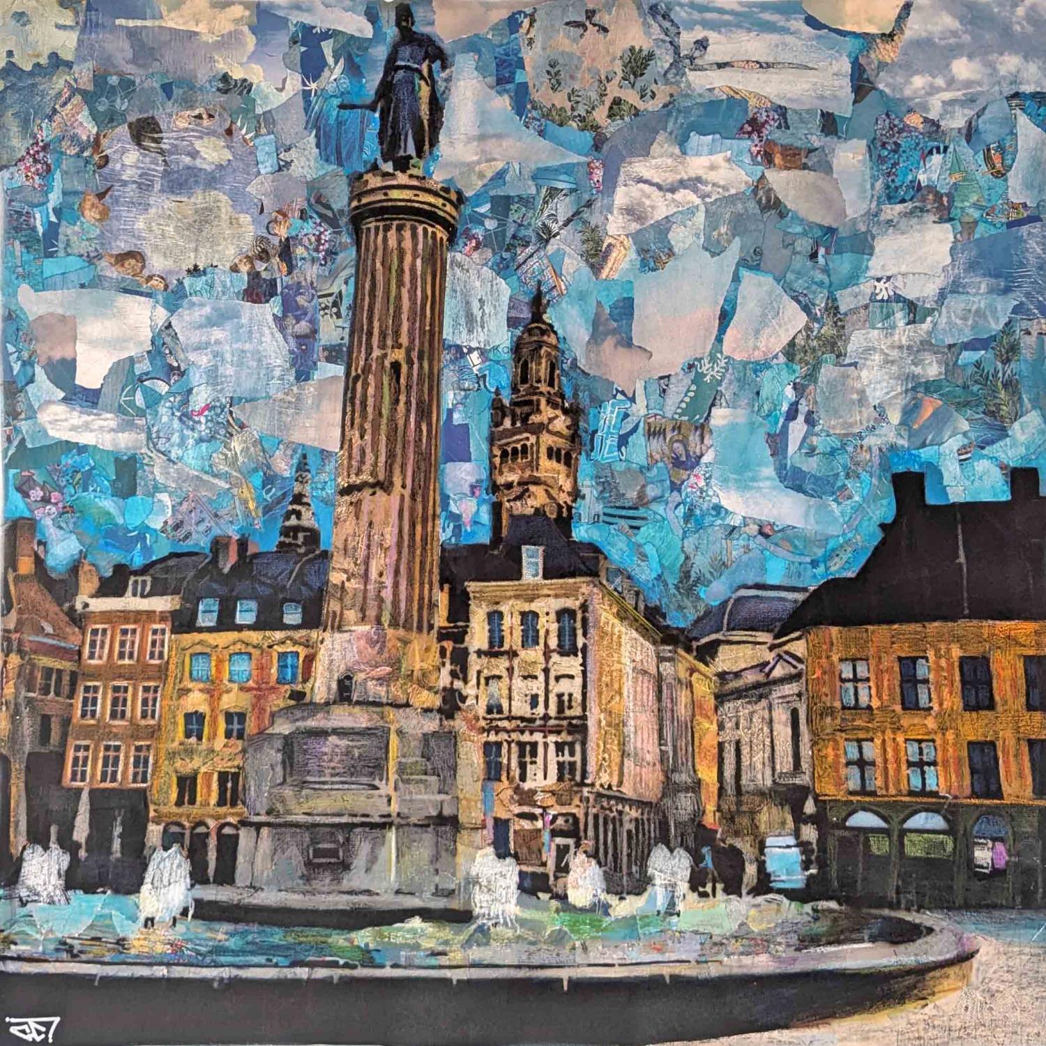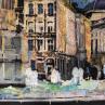 The artist used collage, oil pencil and stencil techniques to create this large-format Pop-art-style painting on linen canvas with an urban theme.