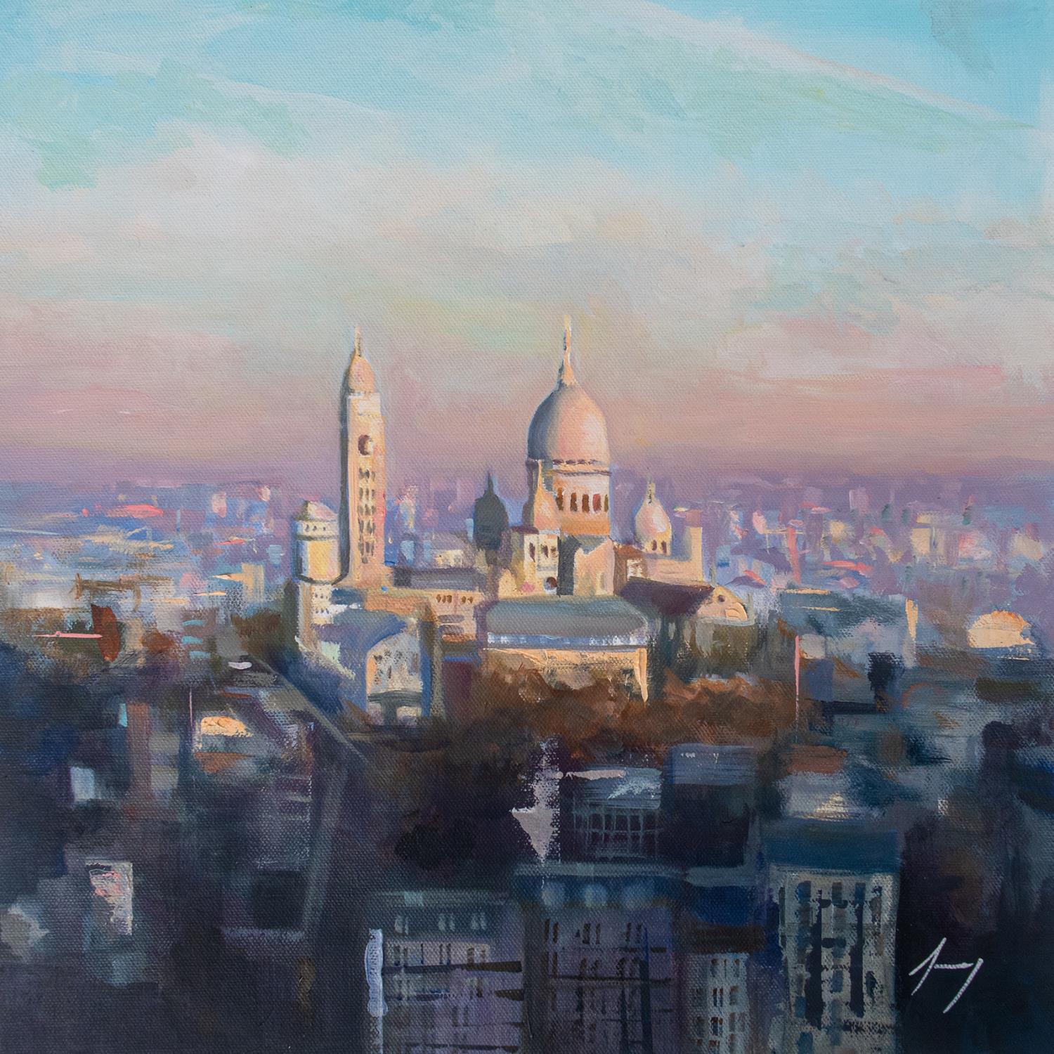 This unique and original contemporary artwork "Lever de soleil sur Montmartre" on the subjects of Landscapes, Urban has been created by the contemporary artist Jung François.