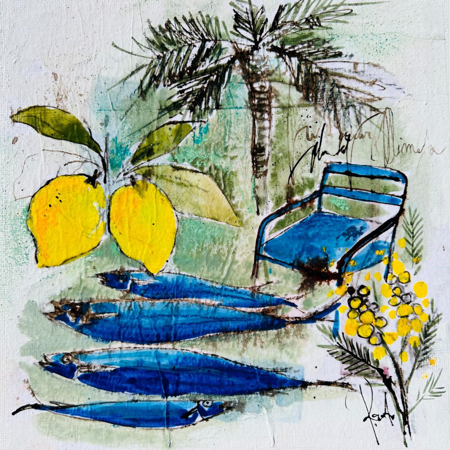 This unique and original contemporary artwork "Citrons et mimosas" on the subjects of Nature, Life style has been created by the contemporary artist Colombo Cécile.