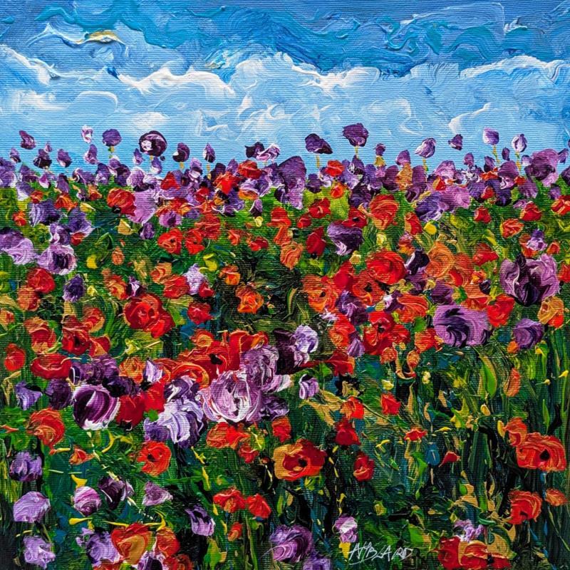 This unique and original contemporary artwork "Coquelicots et pavots violets" on the subjects of Landscapes, Nature has been created by the contemporary artist Amblard Florence.