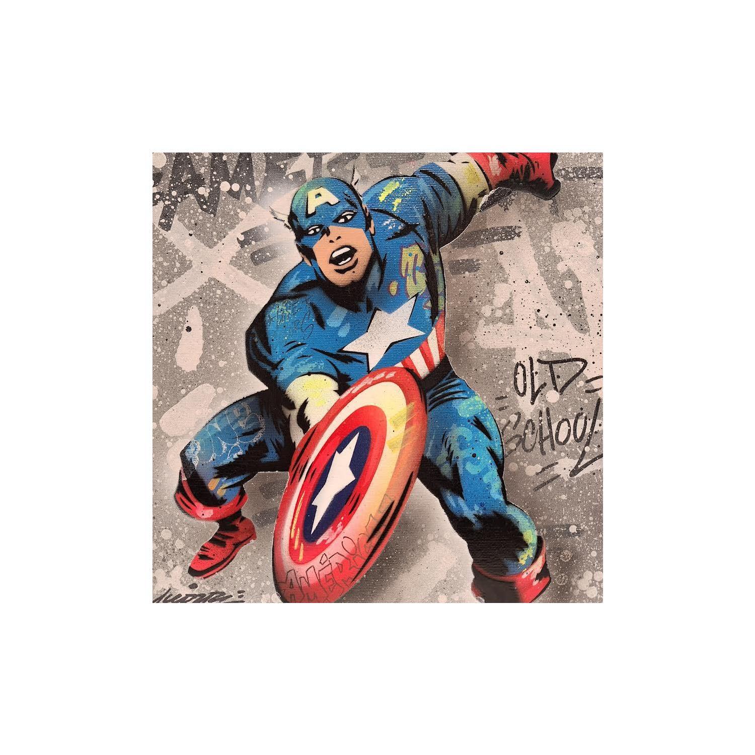 This unique and original contemporary artwork "Captain America Vintage" on the subject of Pop icons has been created by the contemporary artist Kedarone.