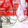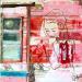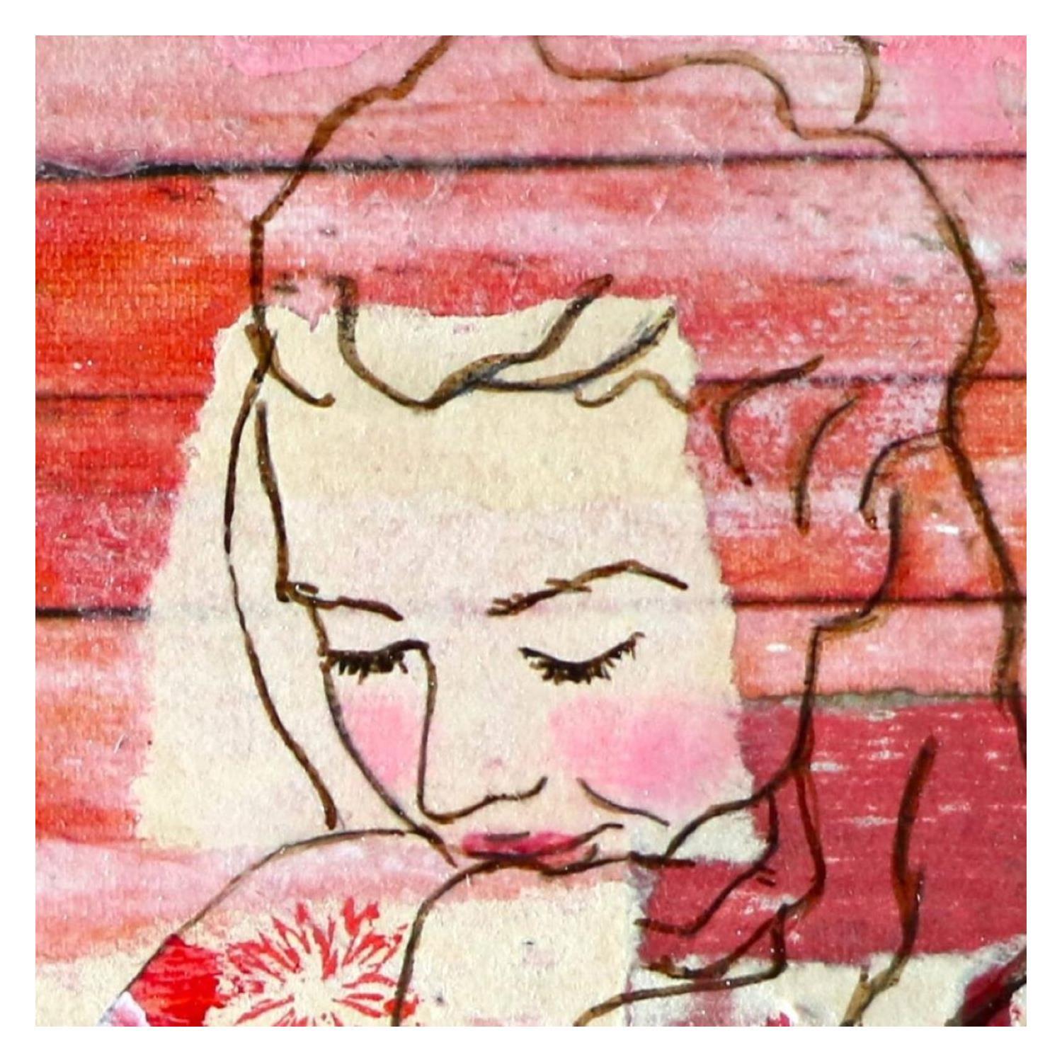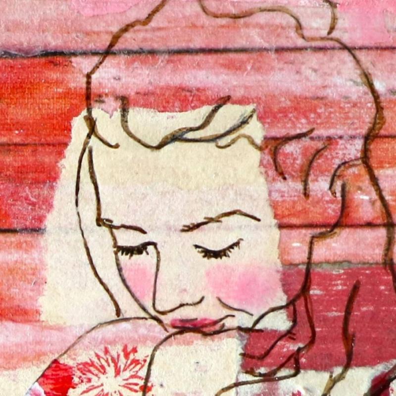 The artist used mixed media, ink, acrylic, stamping and upcycling to create this small-format canvas-on-wood painting in the Art Singulier style.