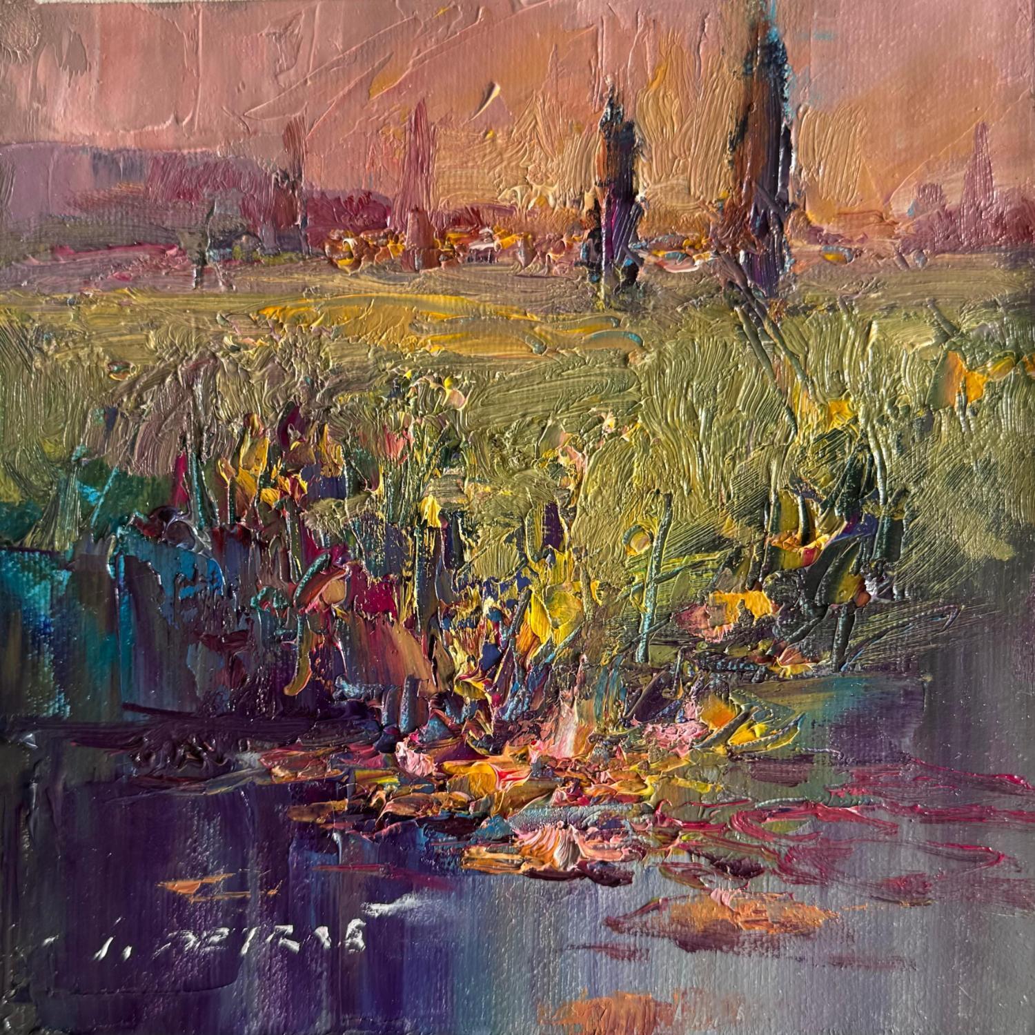 This unique and original contemporary artwork "Sunset in the Meadow" on the subject of Landscapes has been created by the contemporary artist Petras Ivica.