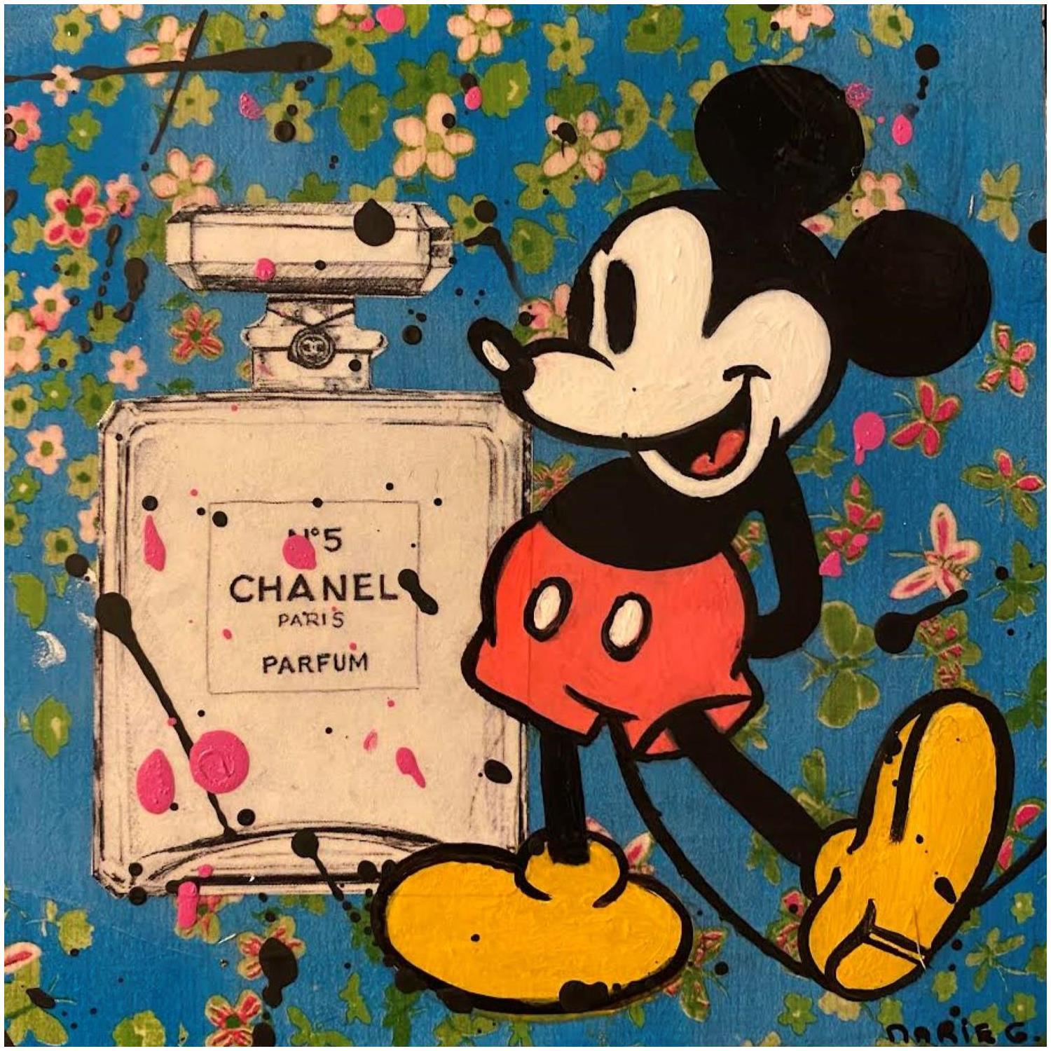 This unique and original contemporary artwork "F1 Mickey Chanel" on the subject of Pop icons has been created by the contemporary artist Marie G. .