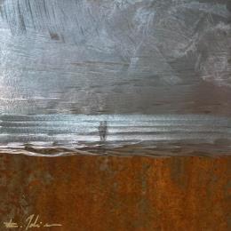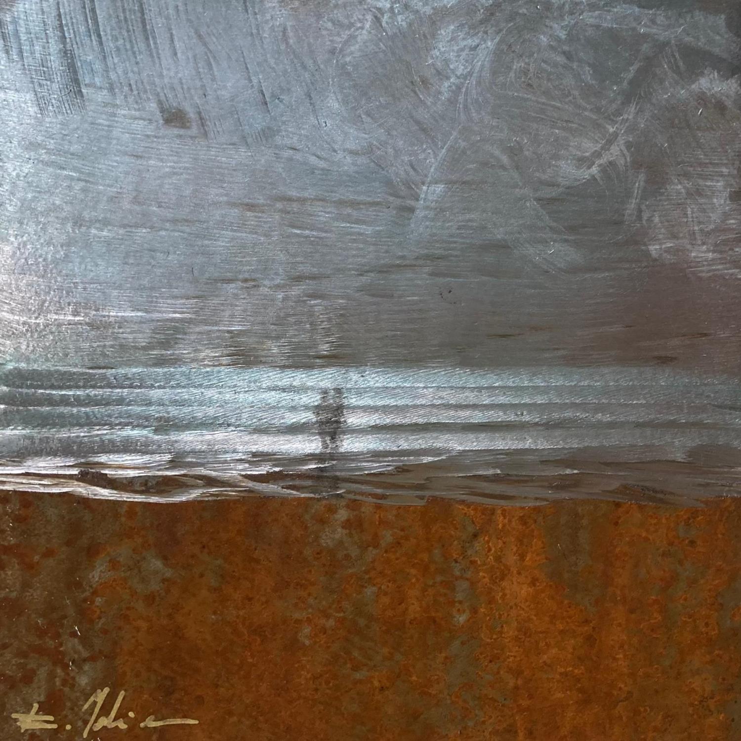The artist used the technique of oxidation on sheet steel to create this small-format Figurative-style painting on Metal on the theme of Landscapes.