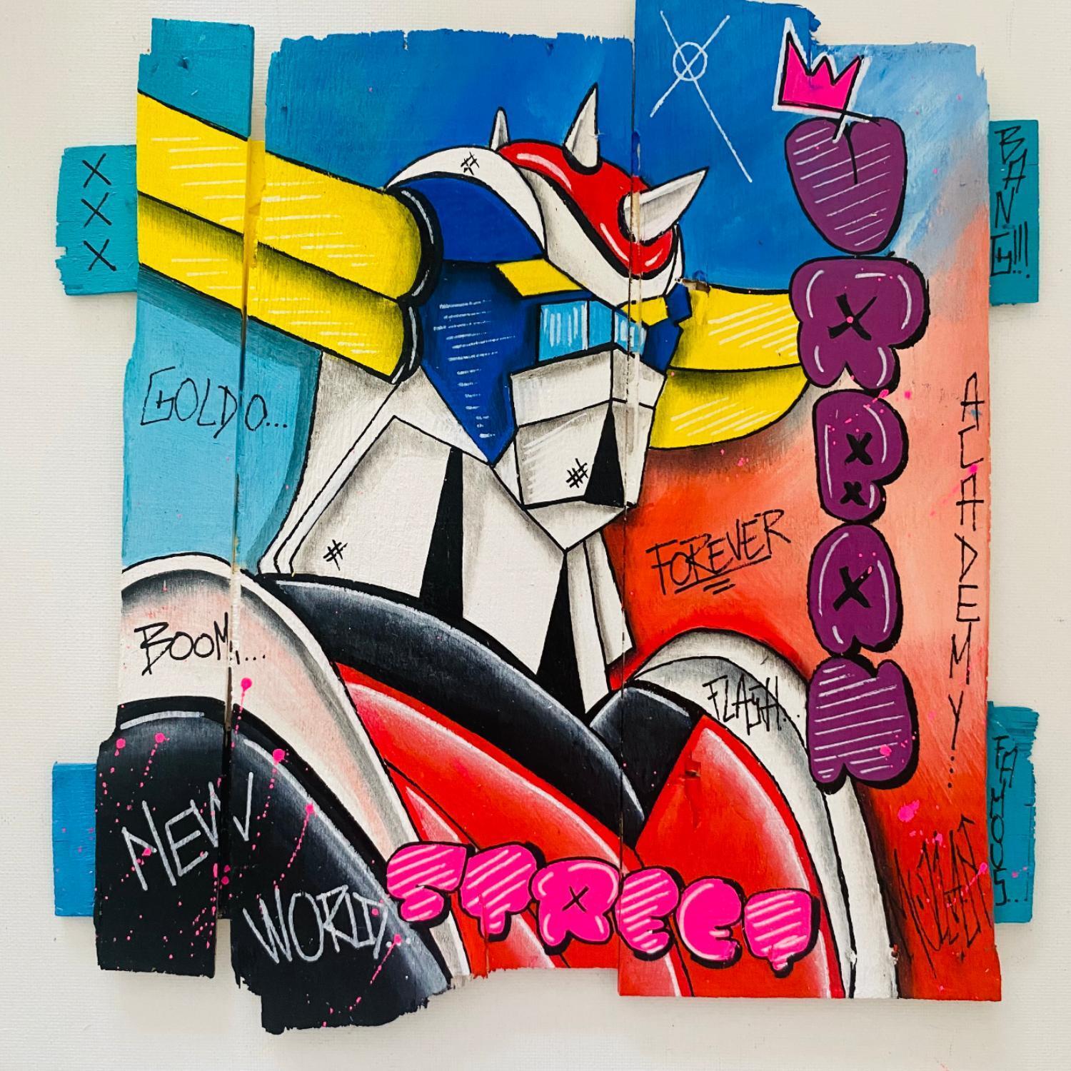 The artist used Acrylic, Wood, Posca media on Wood to create this Pop-art, Small size painting.