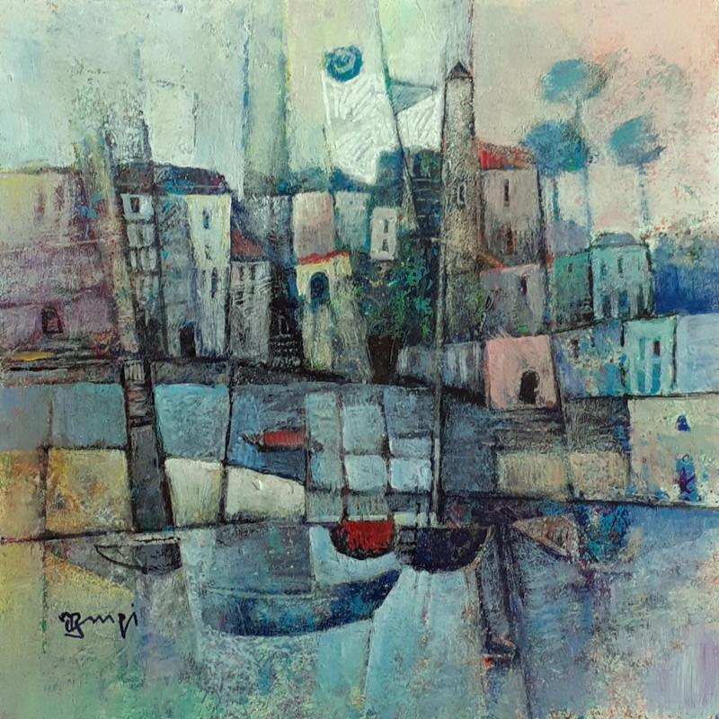 This unique and original contemporary artwork "AL107 LA VILLE BLEUE" on the subjects of Marine, Landscapes, Urban has been created by the contemporary artist Burgi Roger.