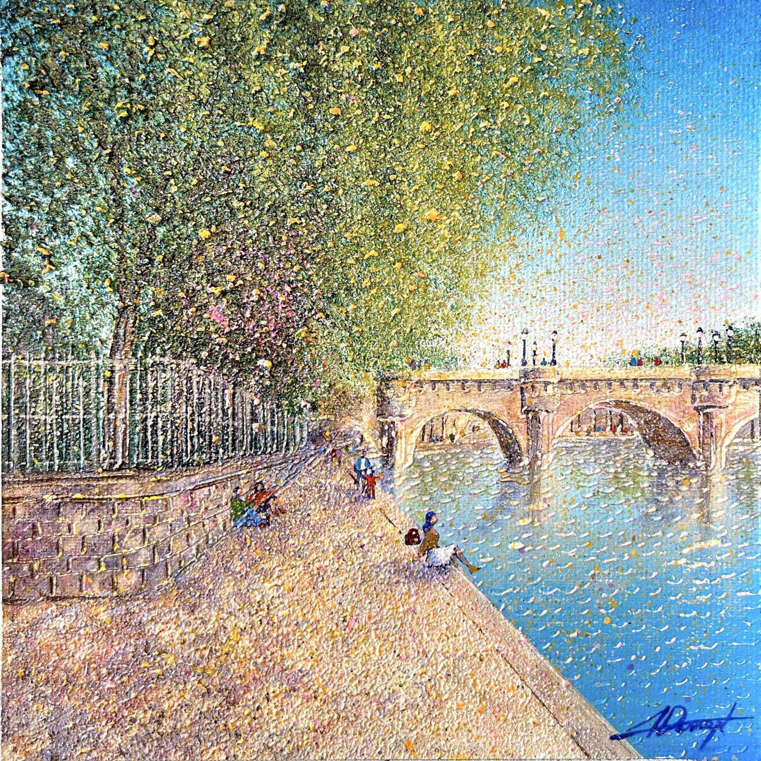 In an impressionist style, based on an urban theme, the artist poetically recreates the unique atmosphere of Parisian streets.