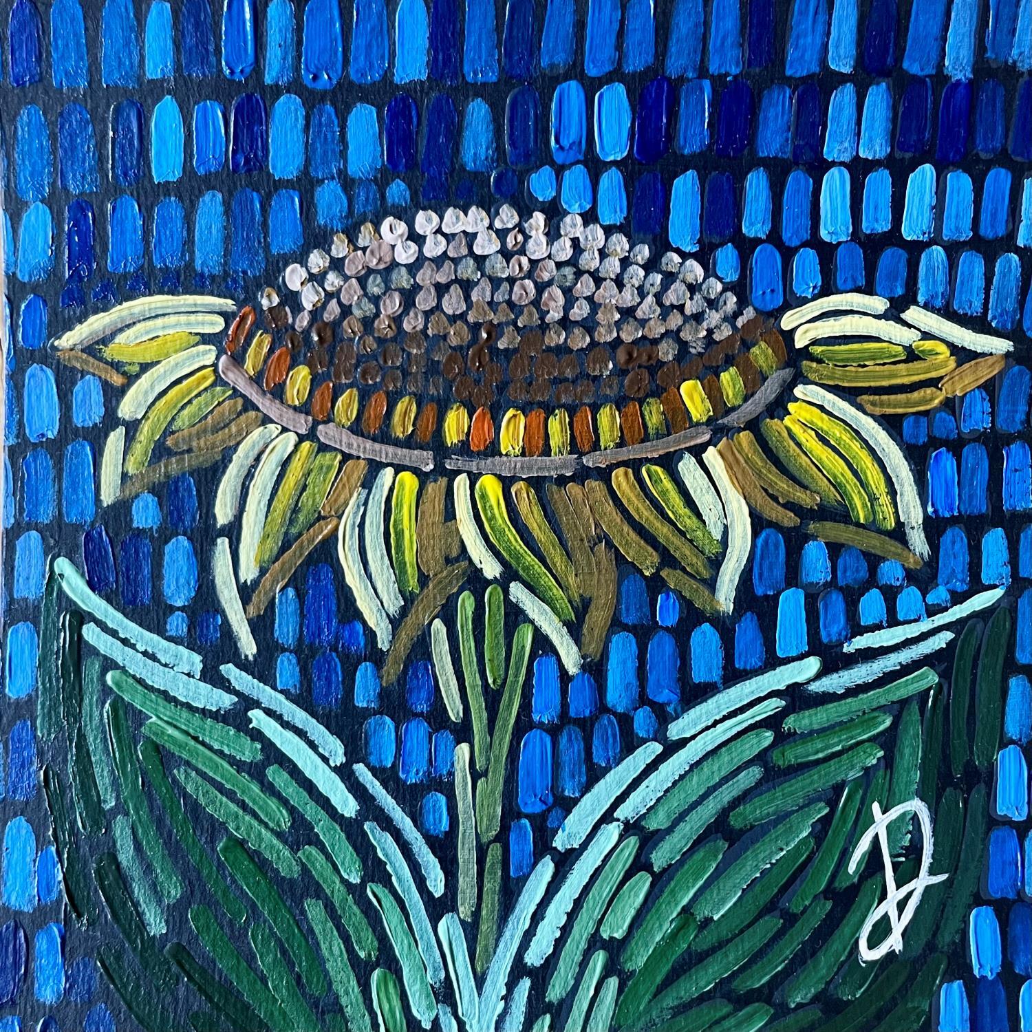 This unique and original contemporary artwork "Tournesol sur bleu" on the subject of Nature has been created by the contemporary artist Dmitrieva Daria.