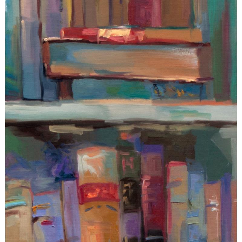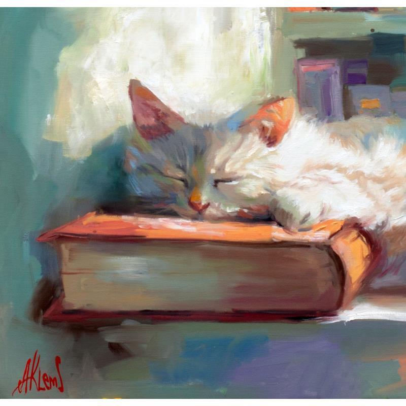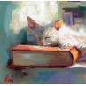 This painting captures a tranquil moment in a cozy space where a cat peacefully sleeps on a stack of books. Set against a background of a well-stocked bookshelf, the warmth of the light and the soft, soothing colors convey a sense of calm and serenity. The contrast between the vibrant books and the restful feline brings a perfect balance of stillness and life.