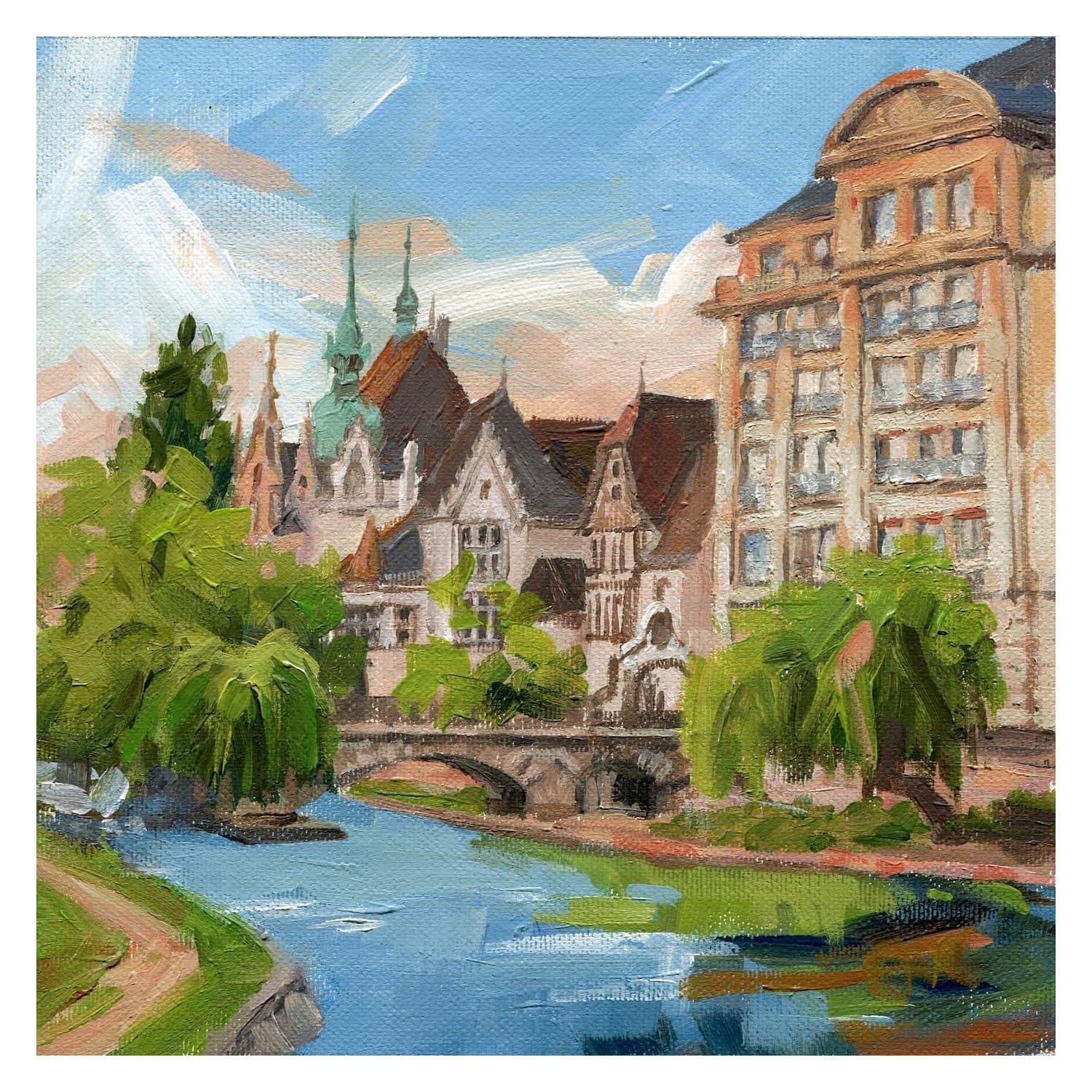 Promenade le long des berges à StrasbourgPintura Promenade le long des berges à Strasbourg por Elisabeth Bazin | Pintura Figurative Landscapes Urban Architecture Acrylic