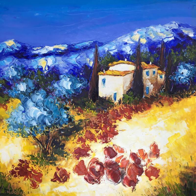 This unique and original contemporary artwork "LES OLIVIERS AUX COQUELIOTS" on the subject of Landscapes has been created by the contemporary artist Sabourin Nathalie.
