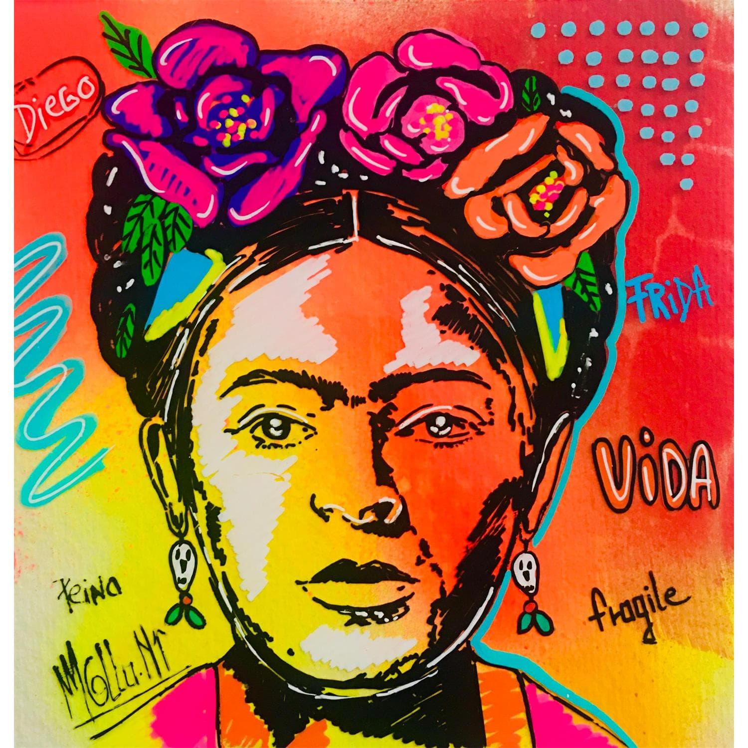 This unique and original contemporary artwork "Frida" on the subject of Portrait has been created by the contemporary artist Molla Nathalie .