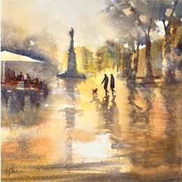 Dog walk in Old townPintura Dog walk in Old town por Jones Henry | Pintura Watercolor