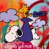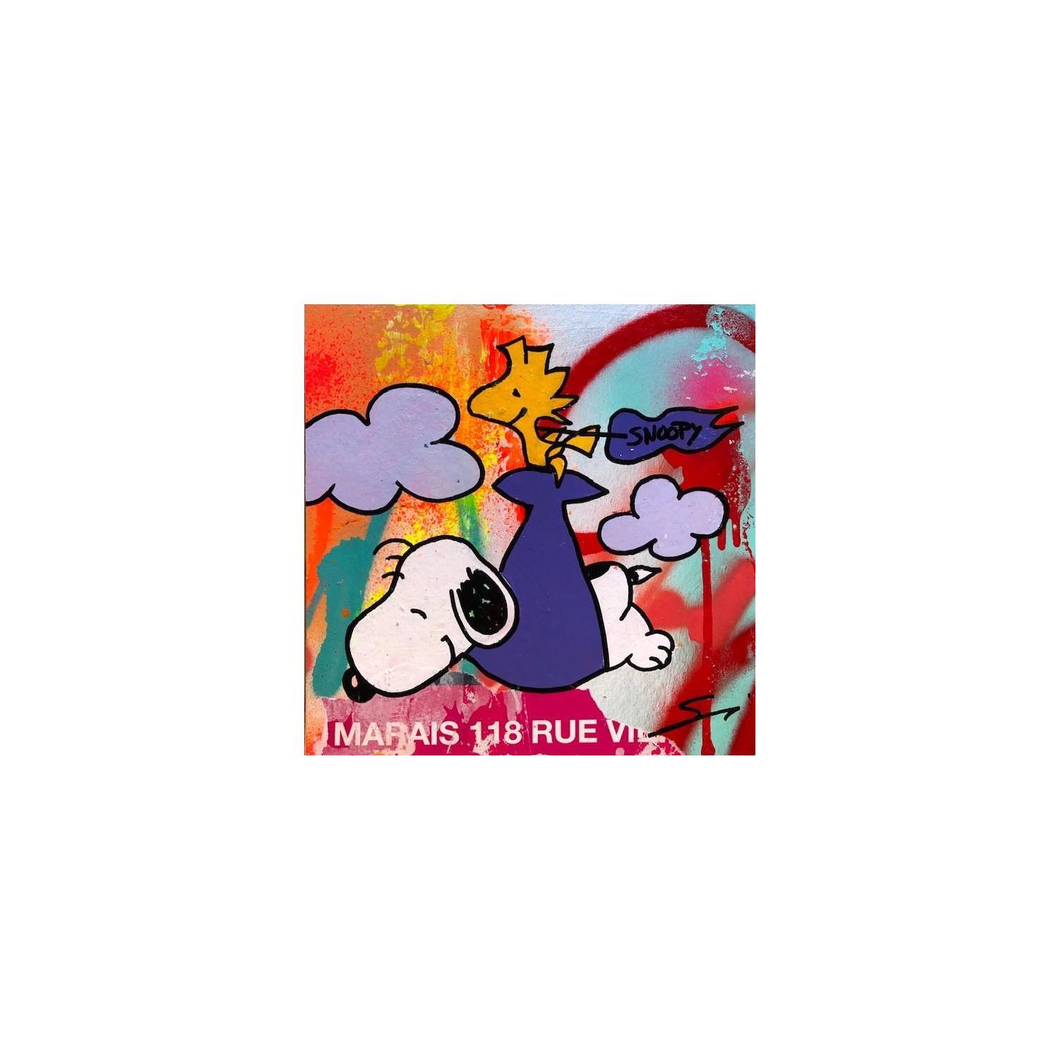 This unique and original contemporary artwork "snoopy is flying" on the subjects of Urban, Pop icons has been created by the contemporary artist Mestres Sergi.