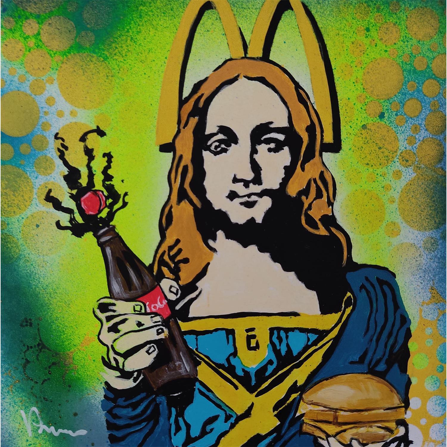 This unique and original contemporary artwork "Whose faith" on the subject of Pop icons has been created by the contemporary artist Przemo.