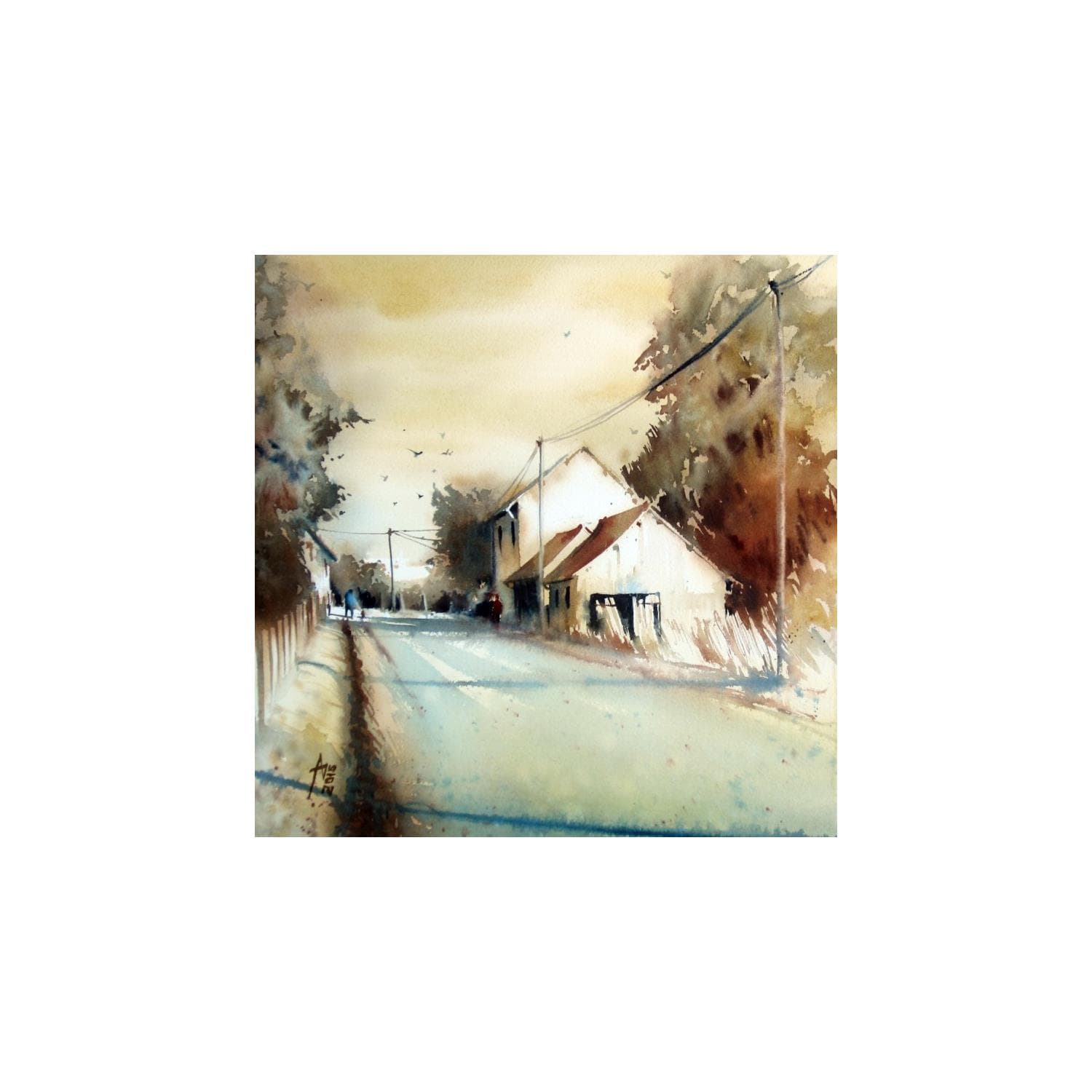 The contemporary artwork A la campagne is a modern painting by the artist Violaine Abbatucci. This is a contemporary painting, unique and originale, Landscape style, using watercolor.